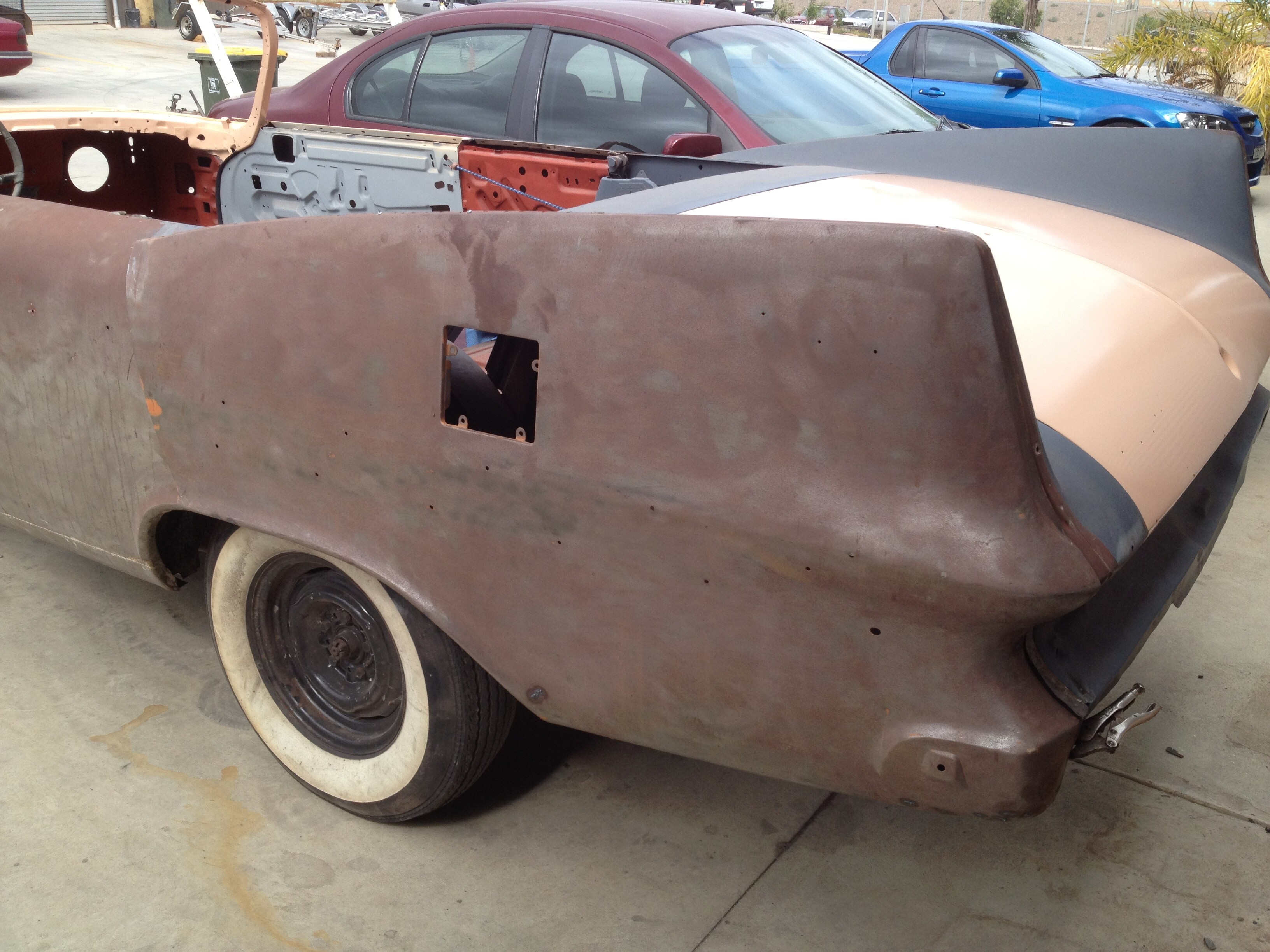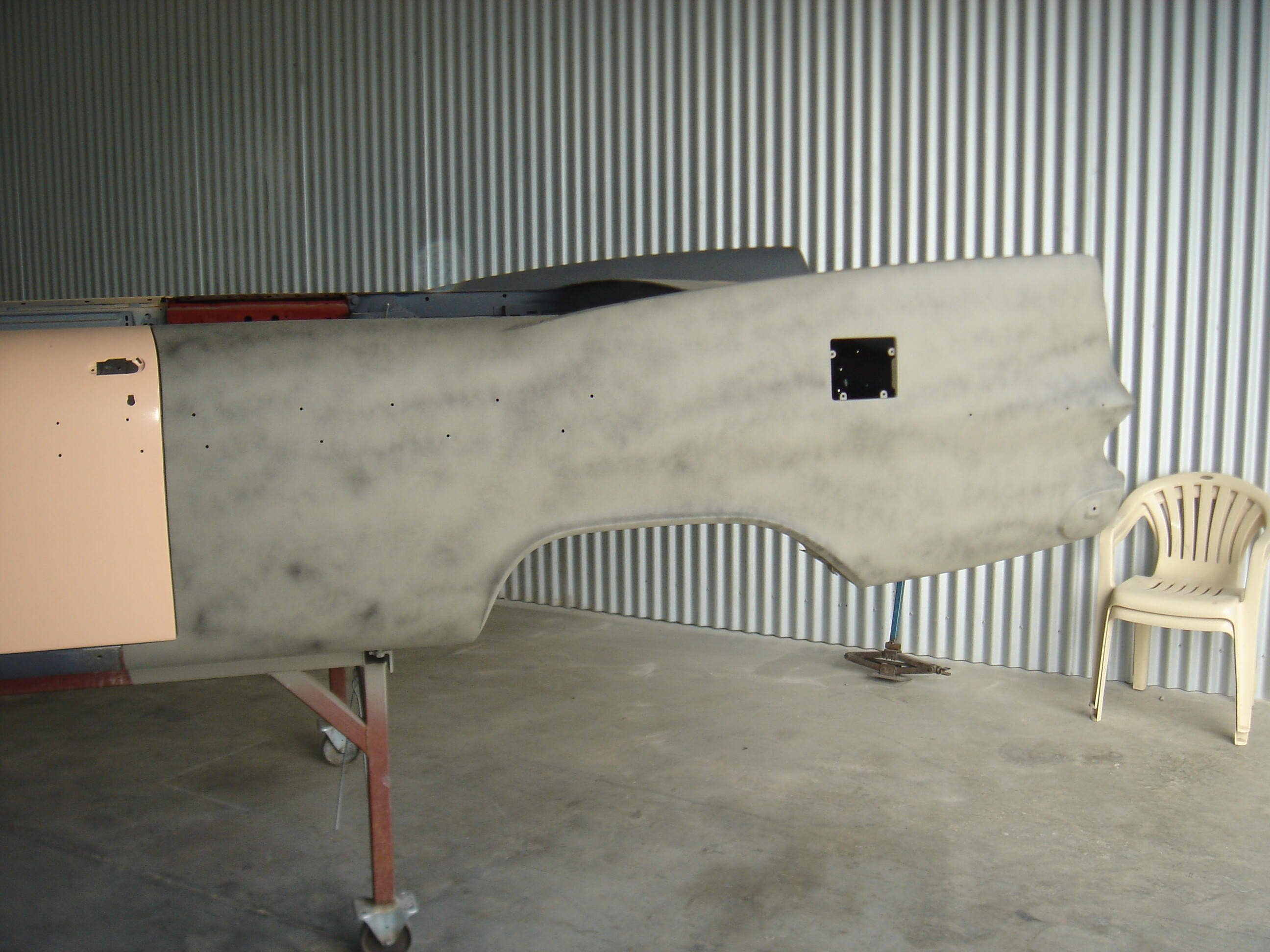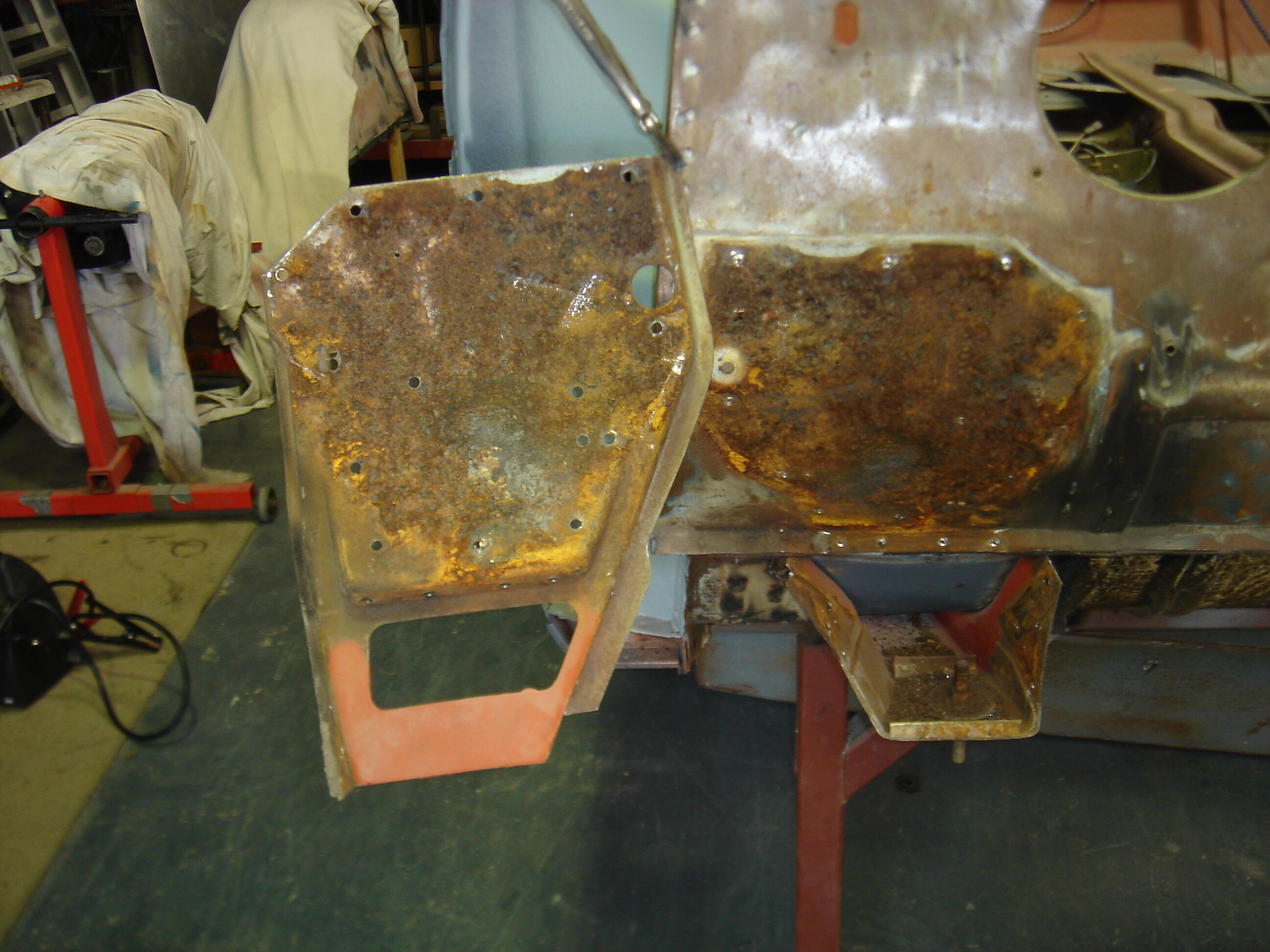 Getting around to the drivers side now. Replacement rear quarter panel due to go in shortly, stripped it and etched primed it today. My coach builder has refabricated the entire inner rear boot panels and panel that supports the spare wheel. Hope to be taking the body of the chassis soon so i can get started on the underbody and chassis itself.