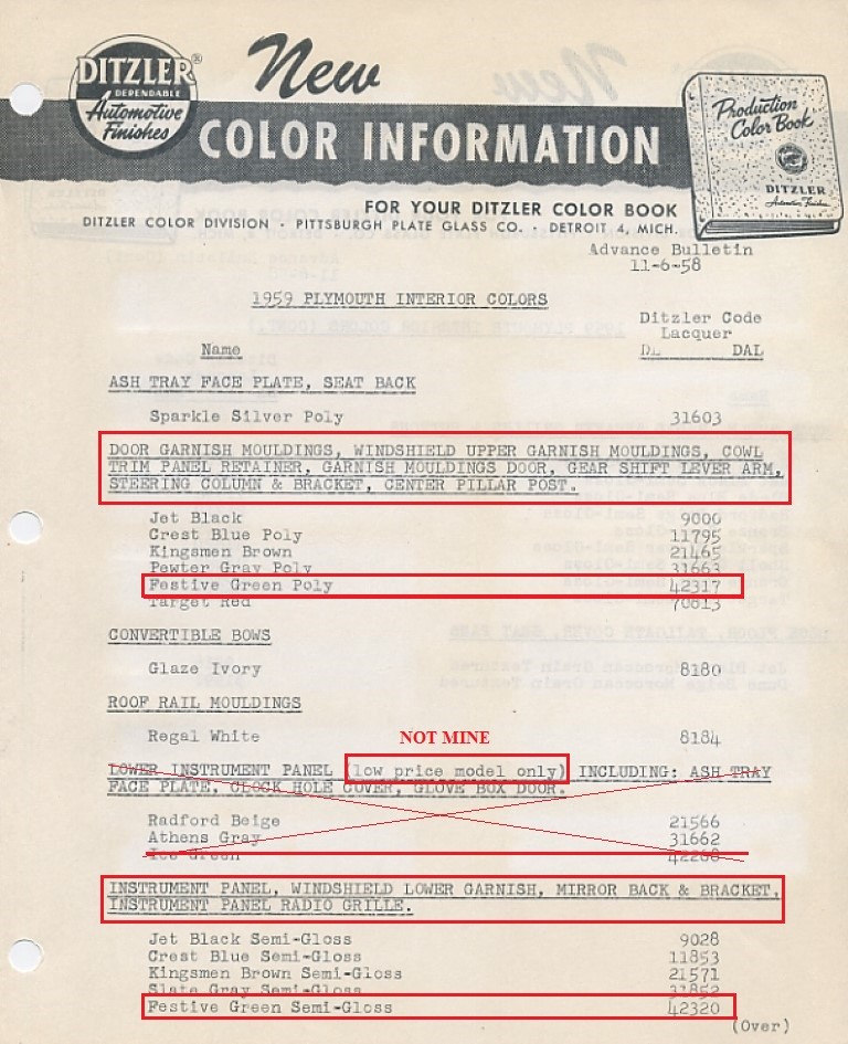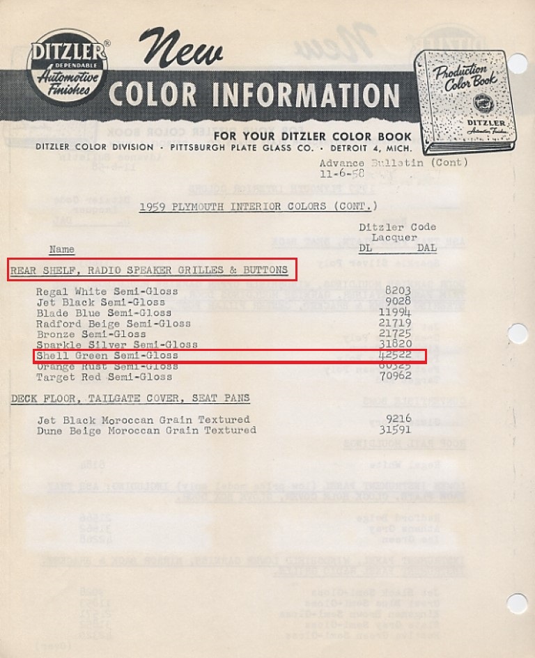 As for taking my info to a paint supplier, I’ve tried online suppliers TCP Global and R&E Paint Supply, and both of them said there is no way to punch in those old interior codes (whether Ditzler, Dupont or otherwise) into a database and have it spit out a mix design. You are right in that I’m just going to have to submit a part for a close match, hopefully one that has been shielded from the sun to some degree.