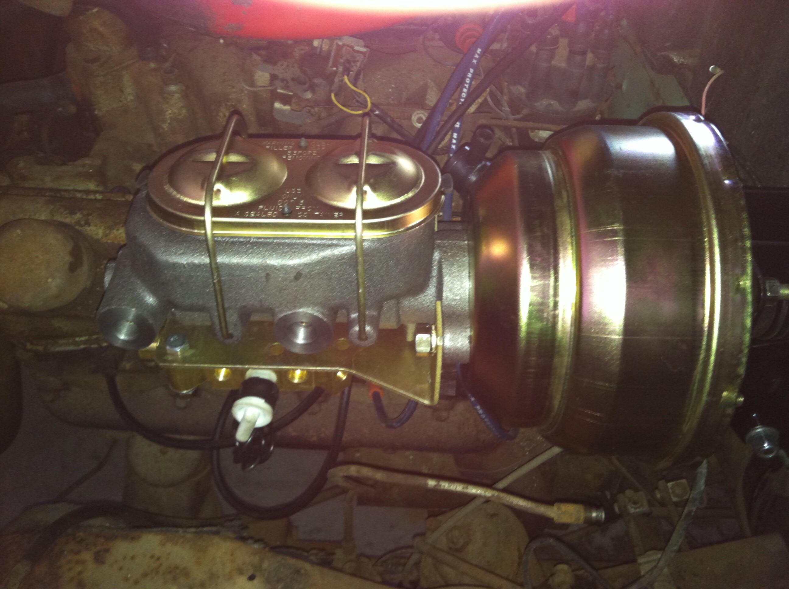 The disc brake set up and power booster is from Roger at AAJ Brakes in Portland Or. I originally got the disc brack conversion brackets from him and the rest of the parts from NAPA etc. I got the power assist unit from him as well as the dual master.The power assist comes from MBM brakes and the dual is a corvette master cylinder. It comes with a bracket to attach to the firewall in place of the original single master and more importantly a piece that slips right in and attaches to the brake pedal. It has a bracket with the proportioning valve underneath it and all the hardware to plumb it. It took me an hr to get it all in and fits good. I have the rear lines to do today and get it bled and I will hopefully get it on the road next week to test them out. Gas tank is rusty so taking it to shop today to get fixed ![]()