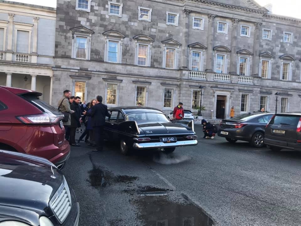 And in order to provide Richard with a grand entrance to the Dáil, Pat made the trek in the limousine from Limerick to Dublin - but, not without incident. Because he needed to be in Dublin by mid-morning, he had to start out in the wee hours in the dark; and the stop and go in proximity to Dublin taxed the charging system with the lights on, and discharged the battery. The engine died, and could not be restarted! The ceremonious entry seemed imperiled while the car sat for an hour, until a Good Samaritan provided a jump, and the observation that the headlights had likely taken their toll. With the lights no longer needed, Pat was again underway in time to meet up with Richard, and stage the triumphant arrival.
