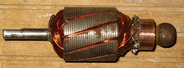 Apart from some inside rust, I can see that the brushes are in good shape; so’s the field magnets and the armature. I’m thinking I can fix this puppy myself! The oil-impregnated bearings have lost their lubricant, and are binding on the shaft; I’ll put some lightweight oil on these and keep them lubricated. And the commutator needs a good cleaning. But I bet it will run again!