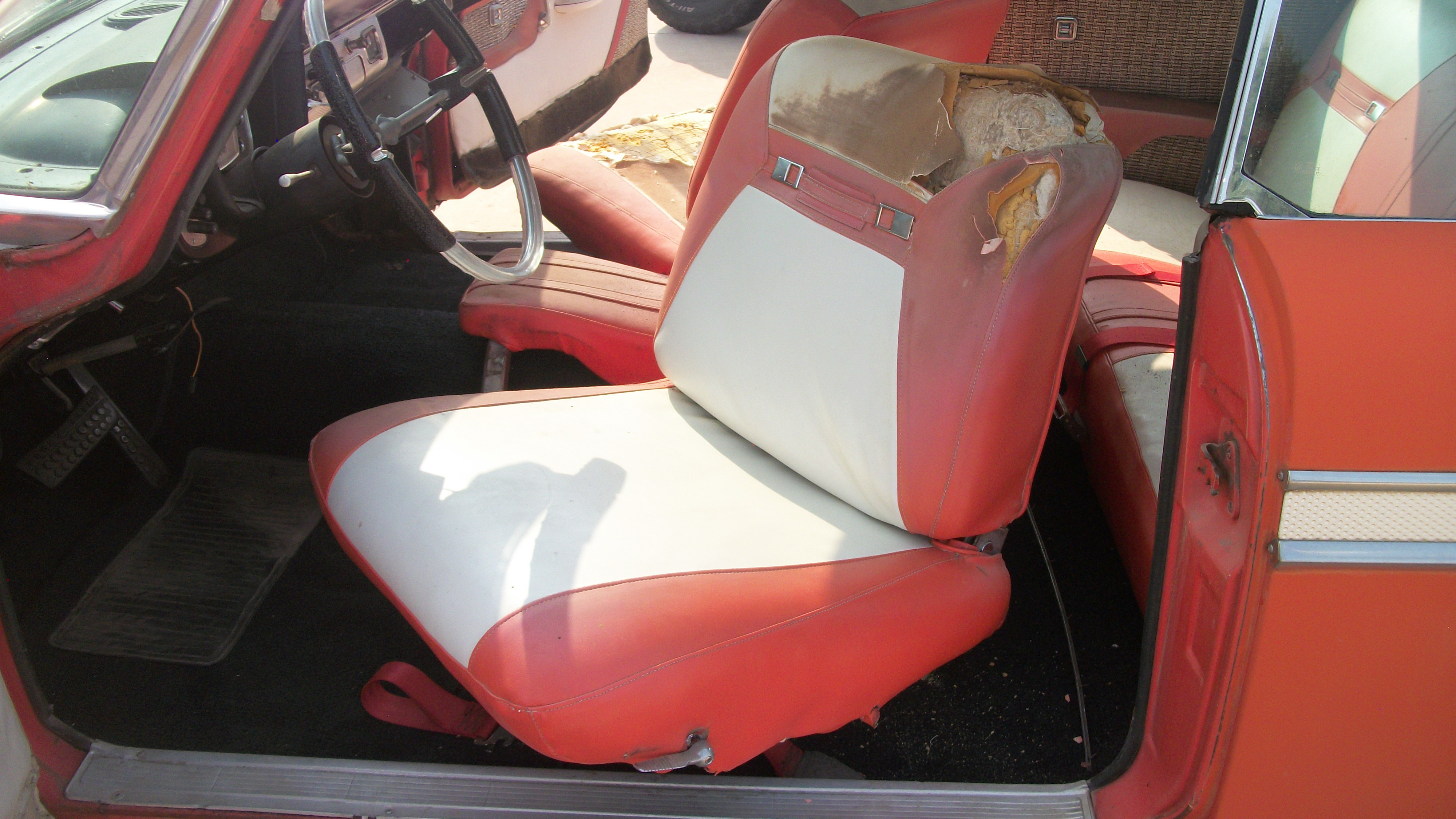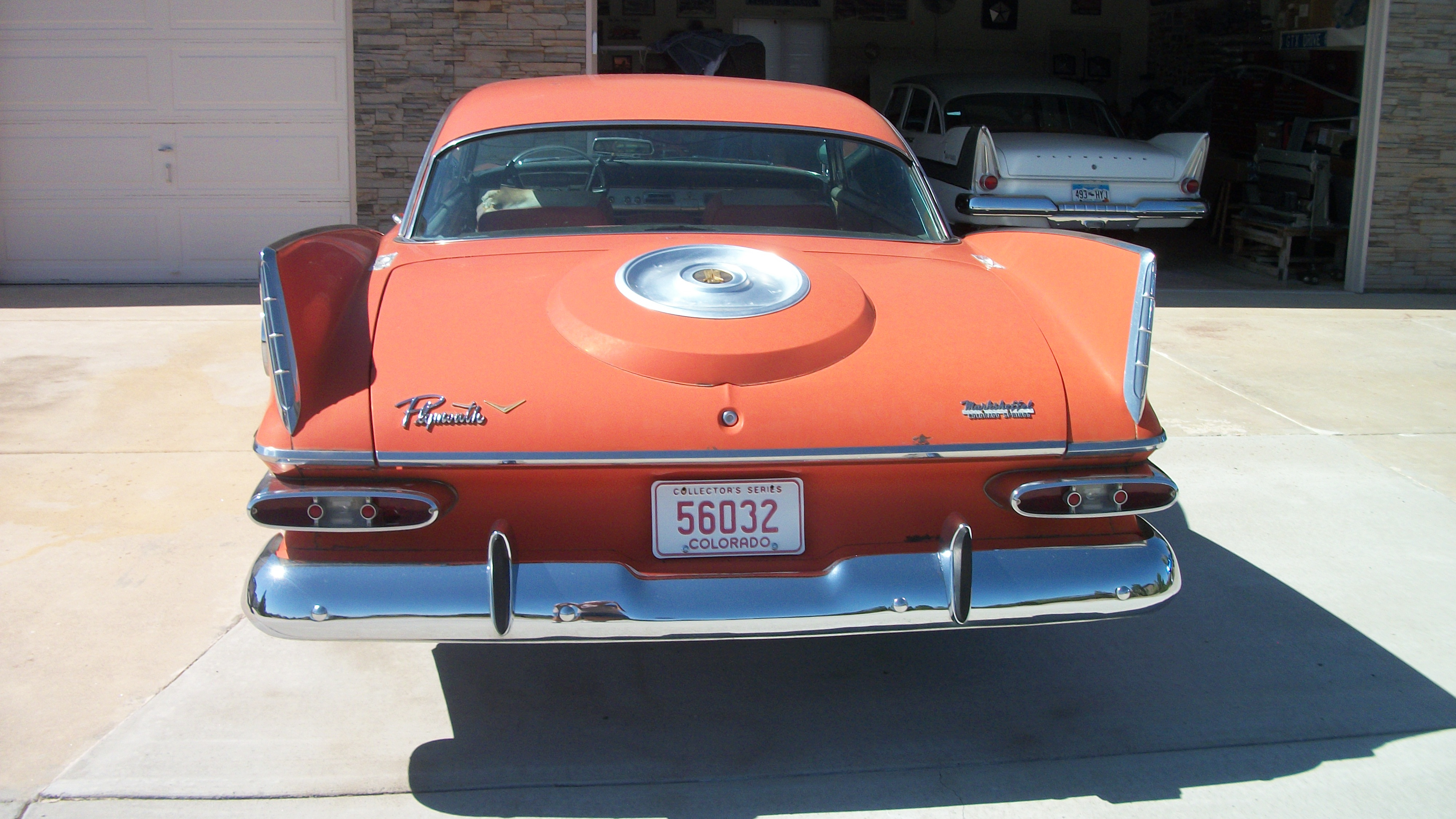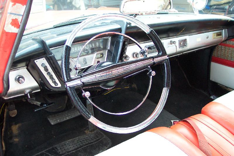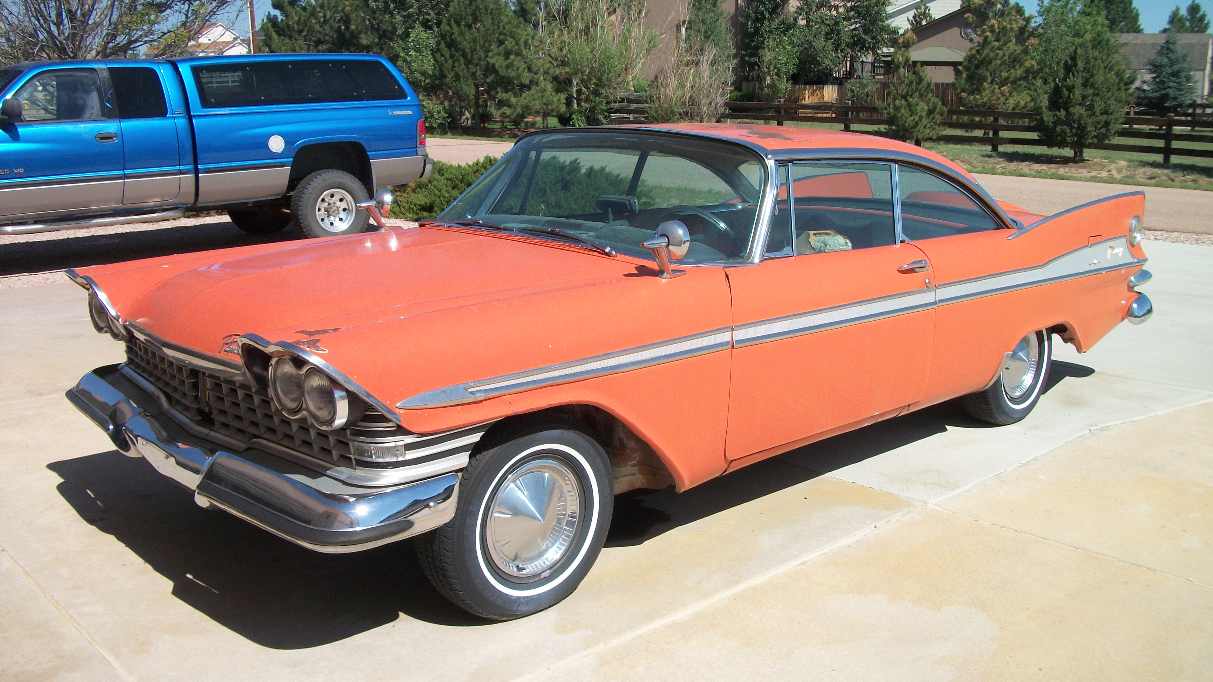 I bought my ’59 locally in October, 2002, from the 2nd owner, and the original 18 year old owner “Carol Jean” bought it on 9/3/59 in Colorado Springs. Since then, I got the 318 to run, repaired the brakes, and installed 4 new tires on 14” x 6” wheels. Collected many parts, including sheet metal, both used and aftermarket. One of the first parts repaired was the steering wheel, recast by D & D Automoblia (ask Ron Keij about his wheel). The bumpers have been straightened and chromed, including the rear guards. The original color was red, and the 1st owner re-upholstered the seats with all vinyl, but she installed the buckles in the buckets.