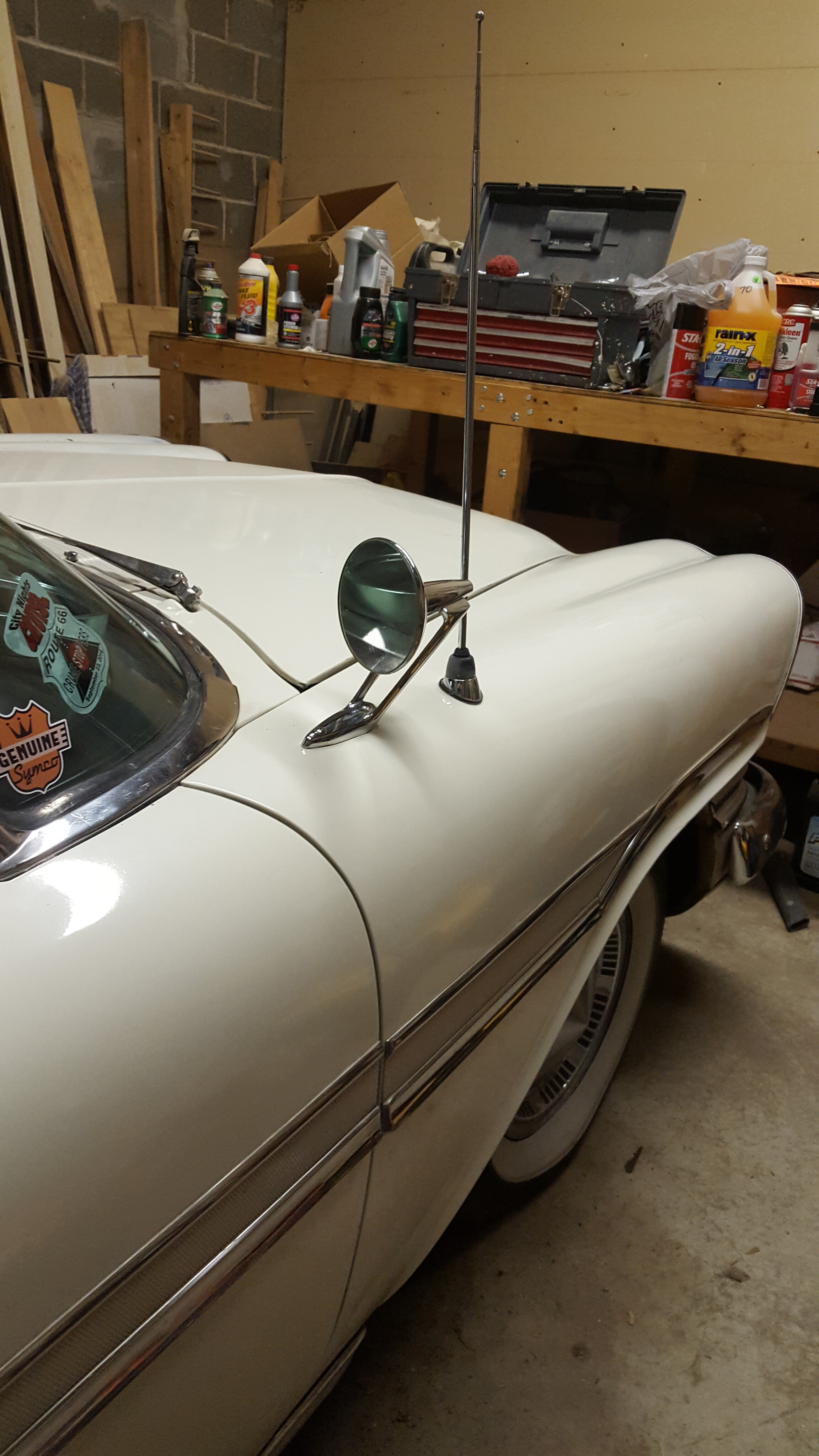 Eroomas; I did mine with the hood hinges off. It is easier to get your hand in there but was still tight.I don’t know if you want to go that route as I had mine off any way. I used Dick Koch’s measurement from one of his past posts but moved it forward about A 1/4 inch as it was running close to A fender rib and would have made it too close for the flat washer to seat flat (maybe use narrow washers).Can’t remember if I used 1/4 or #10 screws and nuts. Like I said it is tight. If you do remove the hinge SCRIBE THE POSITION before it comes off and it will make it easier to locate it when it goes back on and will save hood line up time.If you are right handed( being on the passenger side)and your hand is smaller than mine you may be able to do it with the hinge on. Locate A talented child, all I have are two cats and my wife. No help. Take the measurements from your other mirror,I had to go from scratch. Good luck Mark
