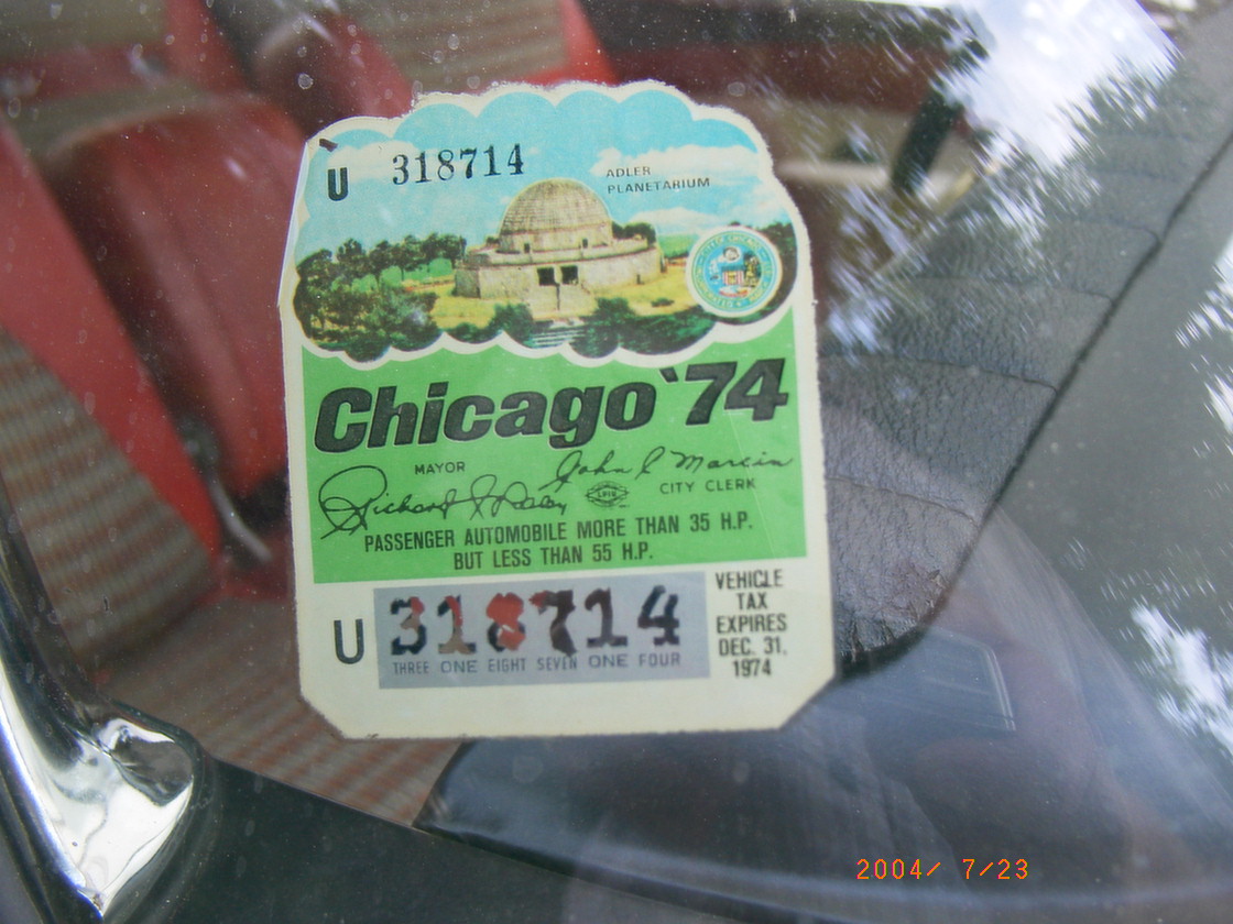 [Last Route – Chicago ’74 Vehicle Tax:] This is the one and only indication of where the Fury was before it came to a Dealer in Florida and then on to Germany. Yet I’m not sure about it. The tax patch says “More than 35 H.P. but less than 55 H.P.” What does it mean?