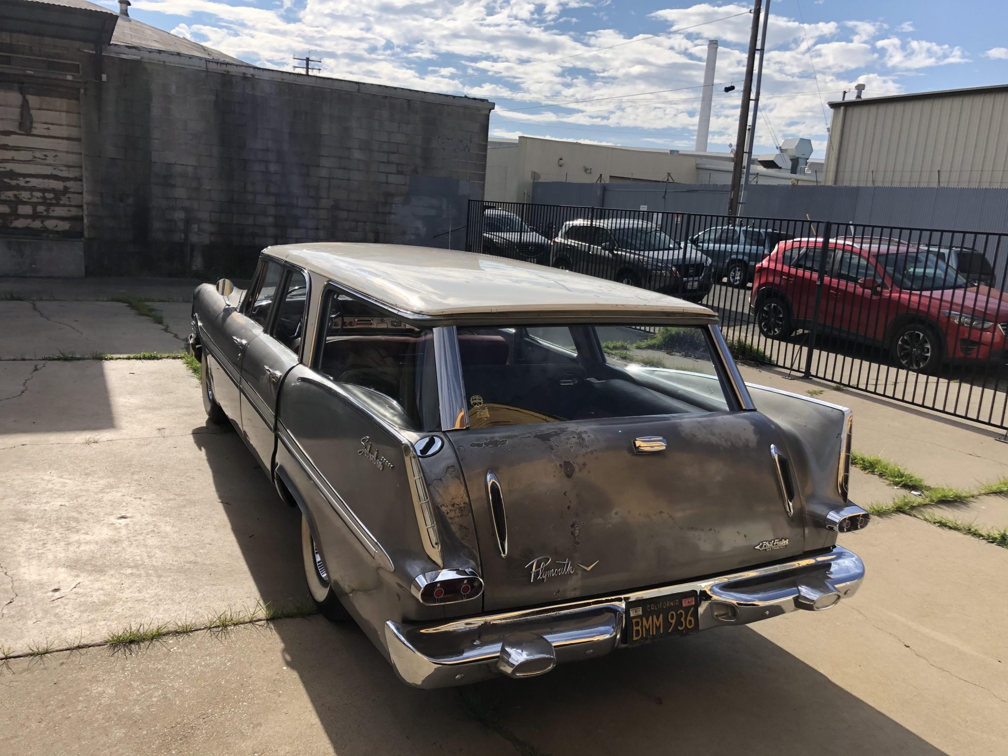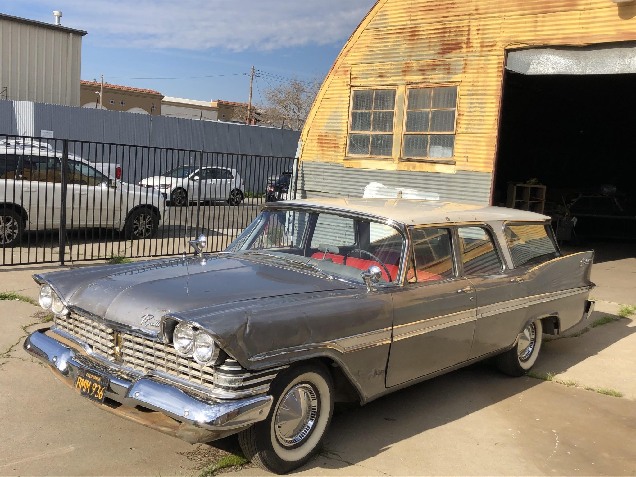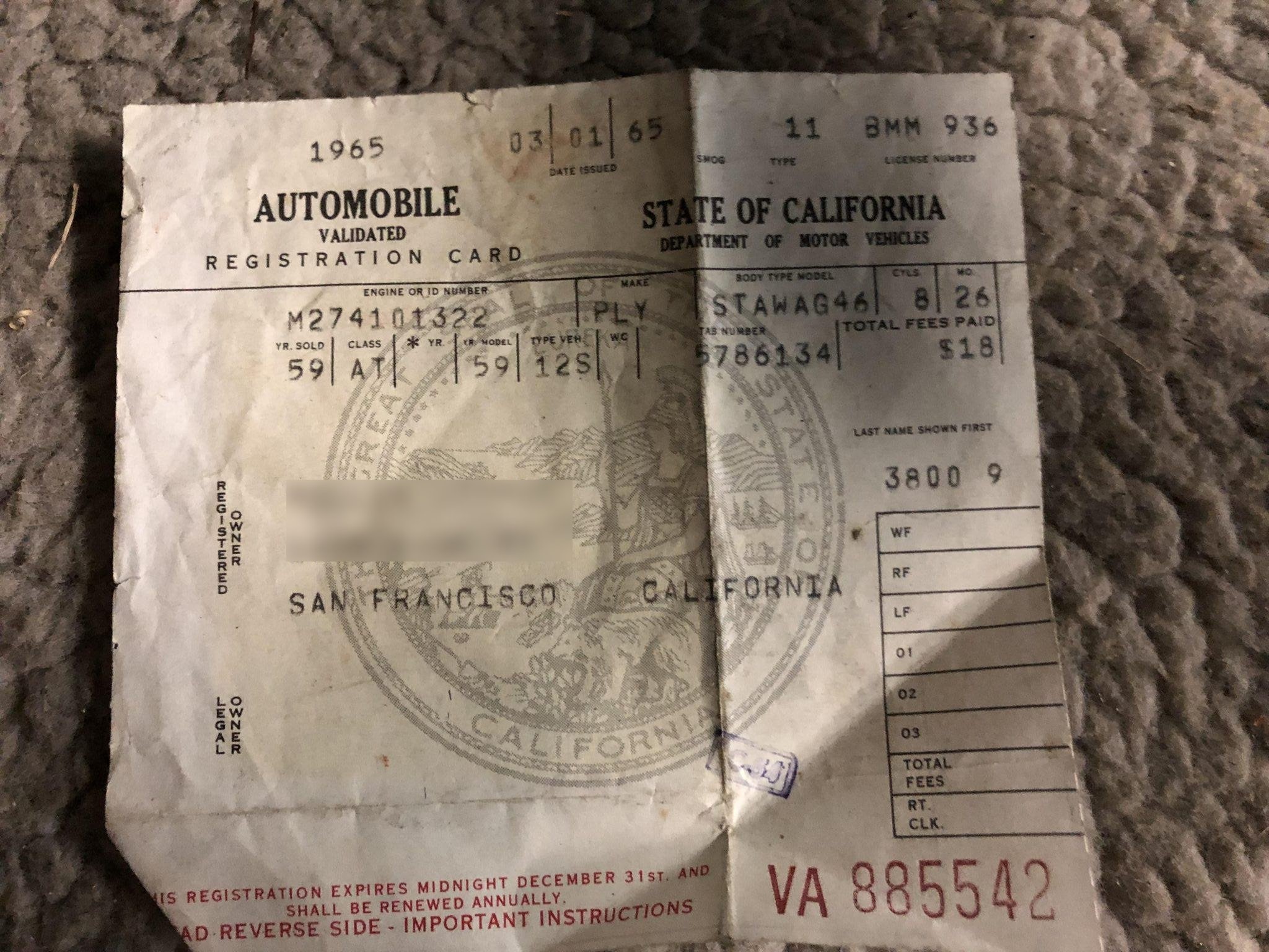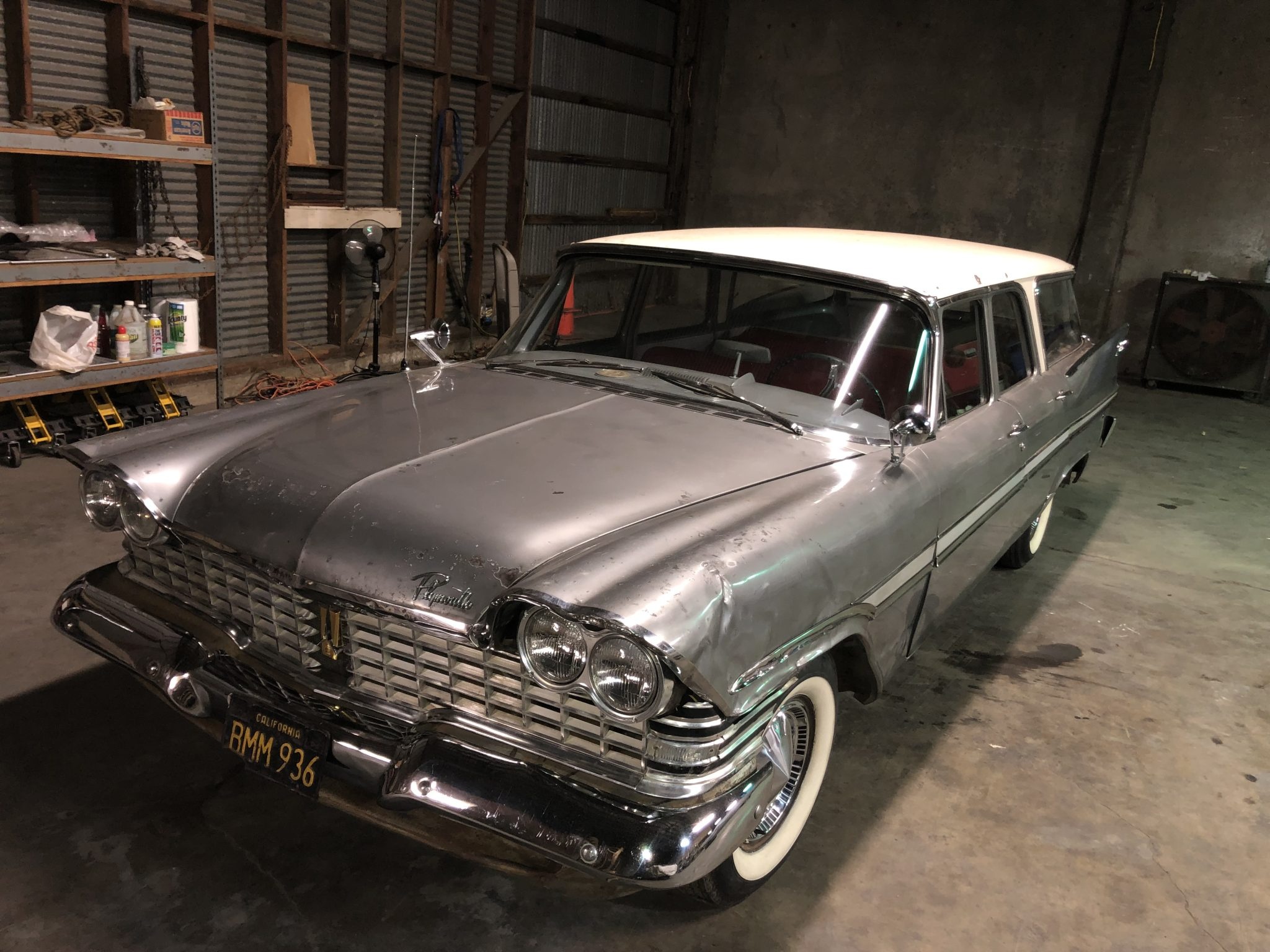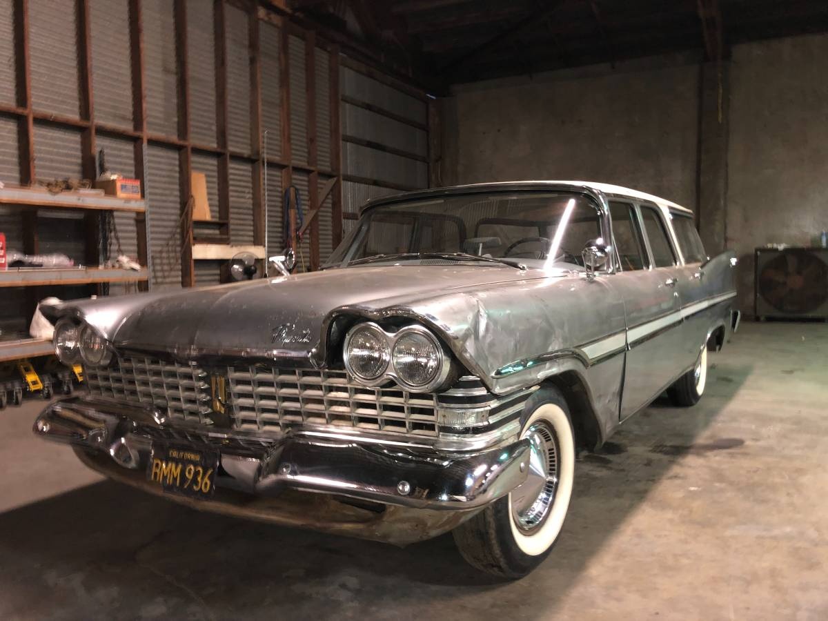 This 1959 Plymouth Suburban Sport station wagon is a non-running project that was purchased new at Phil Frates Plymouth of San Francisco, California. The car was last registered for road use in 1969 when it was parked in a garage until it was acquired by its current owner from the family of its original owner in September 2021. The car is finished in silver with a white roof over a red and gray vinyl interior and is equipped with a 318ci V8 mated to a three-speed automatic transmission. Features include decorative side spears and tail fins, chrome bumpers, a drop-down tailgate with a hand-cranked window, a flat-folding rear seat, a push-button AM radio, and an electric clock. This Suburban Sport wagon is offered by the seller on behalf of its current owner with black California license plates, the car’s contents at the time of its recovery from storage, a tailgate key, and a clean California title in the owner’s name.