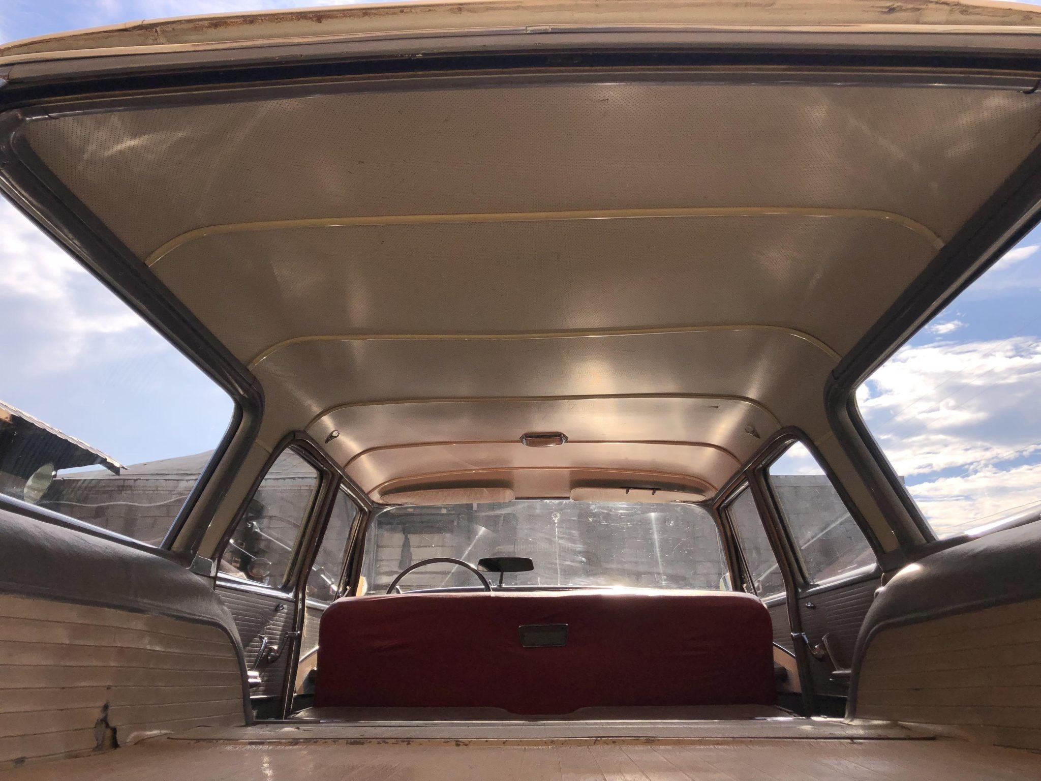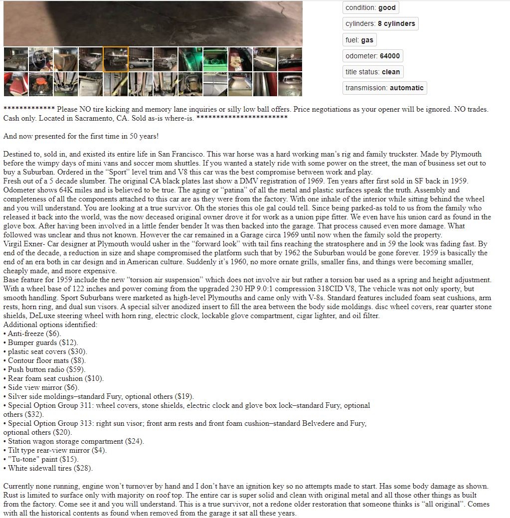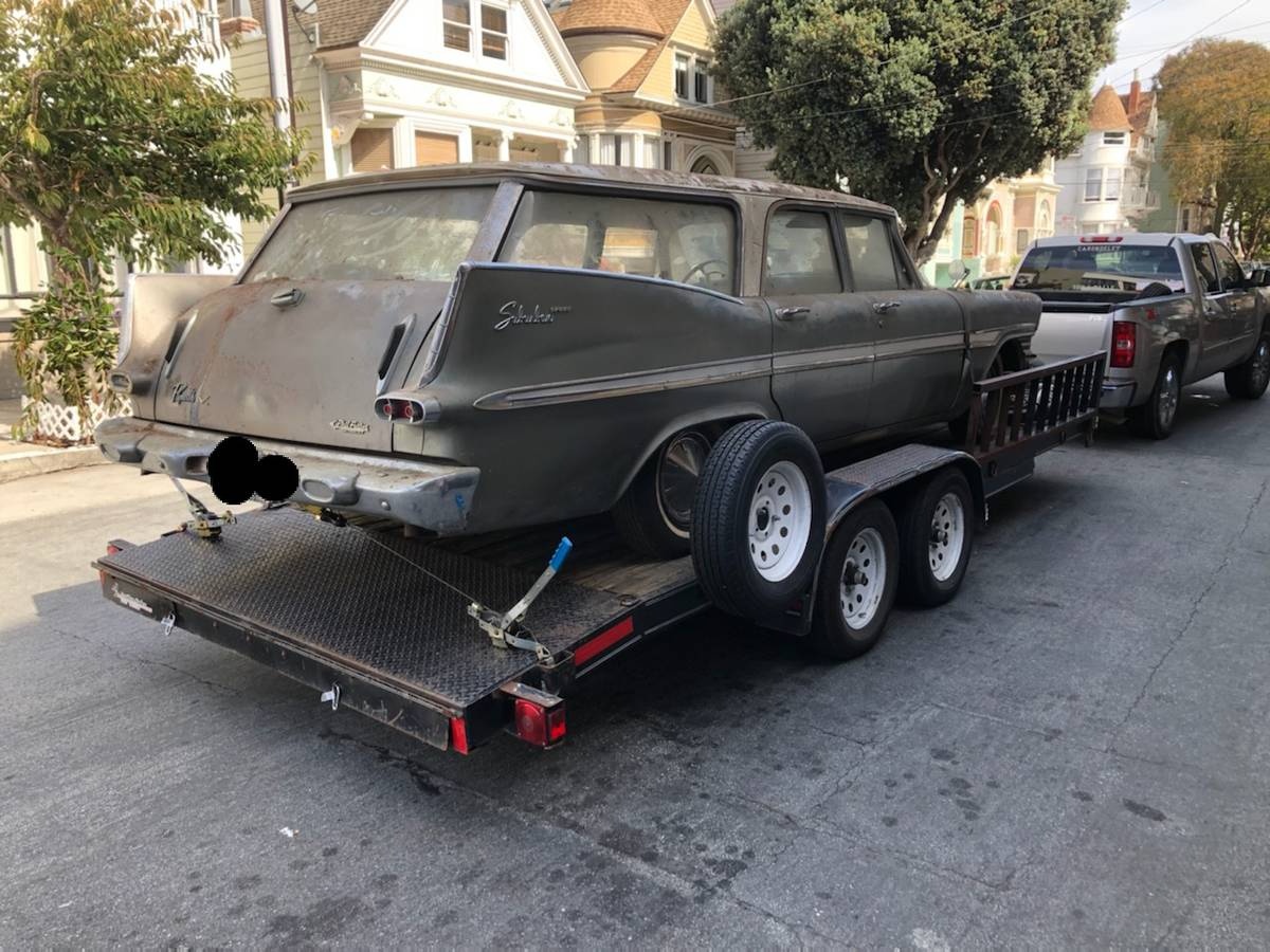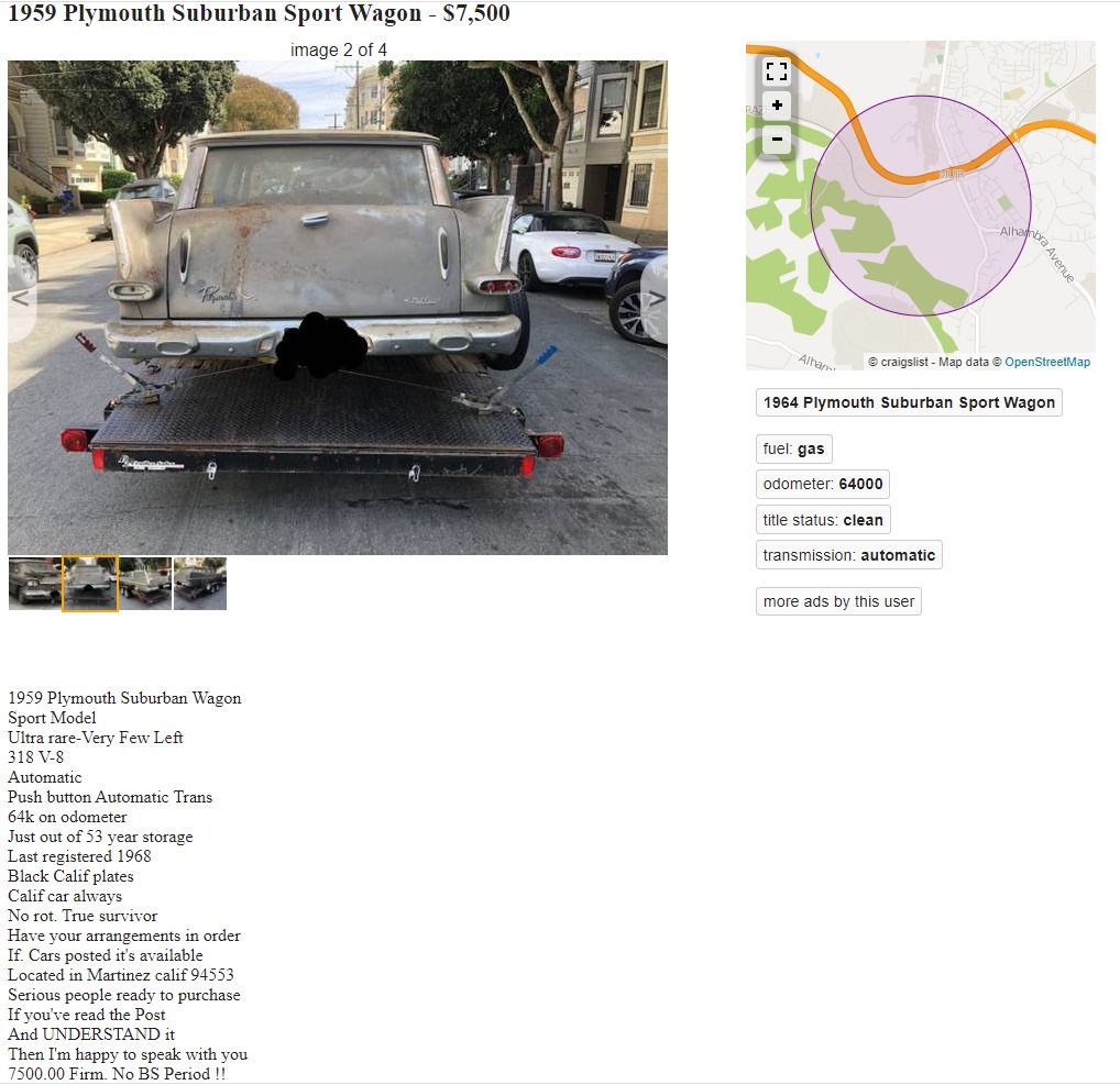This 1959 Plymouth Suburban Sport station wagon is a non-running project that was purchased new at Phil Frates Plymouth of San Francisco, California. The car was last registered for road use in 1969 when it was parked in a garage until it was acquired by its current owner from the family of its original owner in September 2021. The car is finished in silver with a white roof over a red and gray vinyl interior and is equipped with a 318ci V8 mated to a three-speed automatic transmission. Features include decorative side spears and tail fins, chrome bumpers, a drop-down tailgate with a hand-cranked window, a flat-folding rear seat, a push-button AM radio, and an electric clock. This Suburban Sport wagon is offered by the seller on behalf of its current owner with black California license plates, the car’s contents at the time of its recovery from storage, a tailgate key, and a clean California title in the owner’s name.