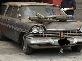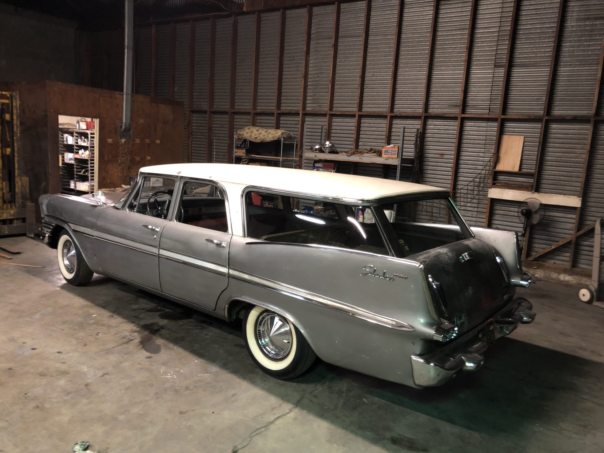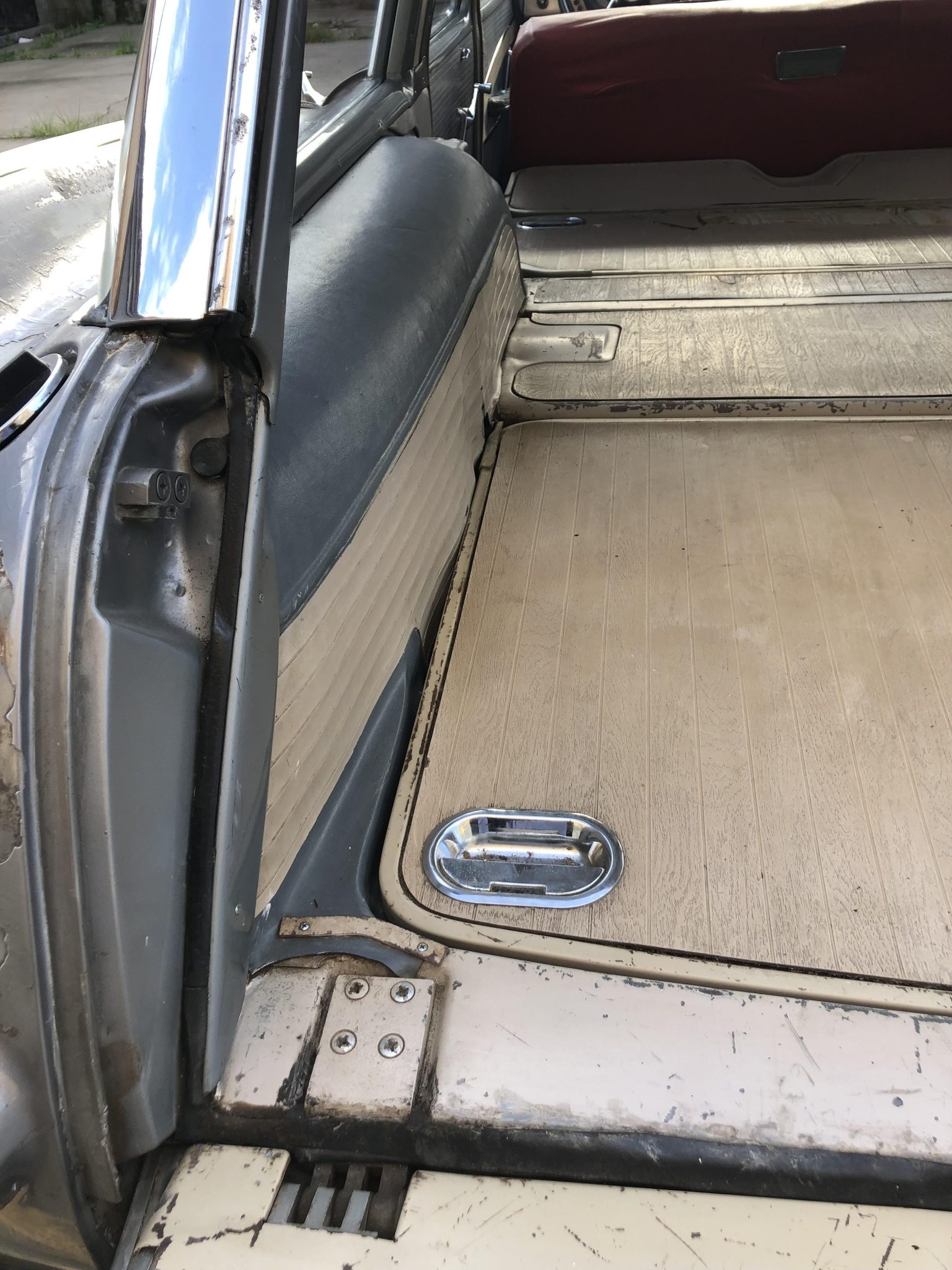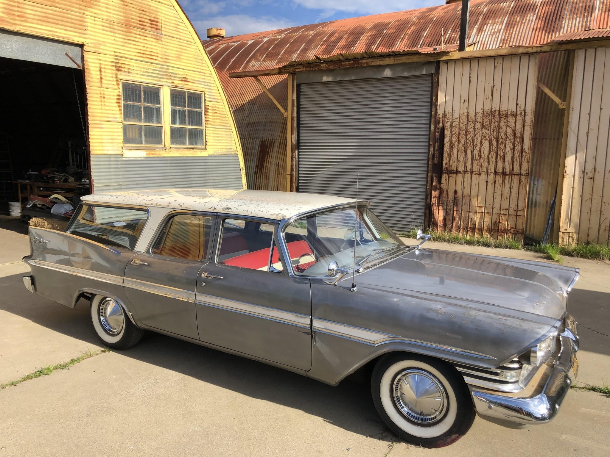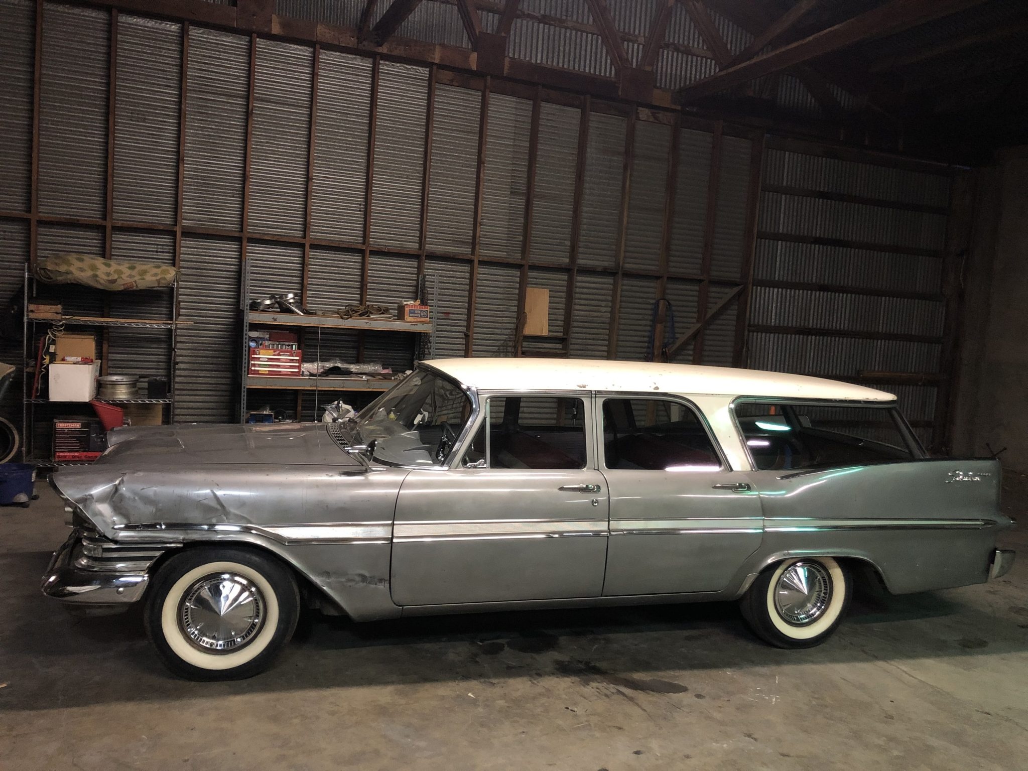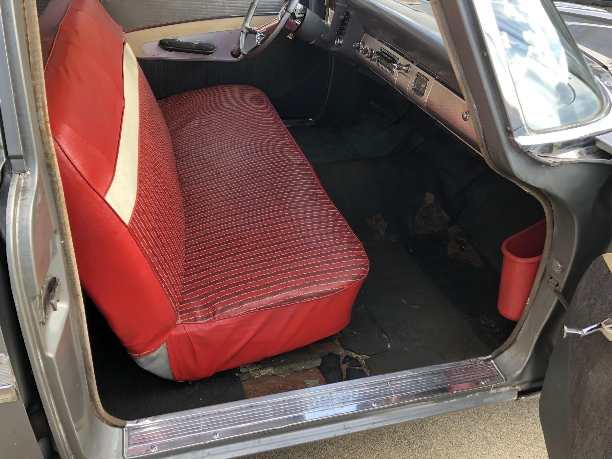 This 1959 Plymouth Suburban Sport station wagon is a non-running project that was purchased new at Phil Frates Plymouth of San Francisco, California. The car was last registered for road use in 1969 when it was parked in a garage until it was acquired by its current owner from the family of its original owner in September 2021. The car is finished in silver with a white roof over a red and gray vinyl interior and is equipped with a 318ci V8 mated to a three-speed automatic transmission. Features include decorative side spears and tail fins, chrome bumpers, a drop-down tailgate with a hand-cranked window, a flat-folding rear seat, a push-button AM radio, and an electric clock. This Suburban Sport wagon is offered by the seller on behalf of its current owner with black California license plates, the car’s contents at the time of its recovery from storage, a tailgate key, and a clean California title in the owner’s name.