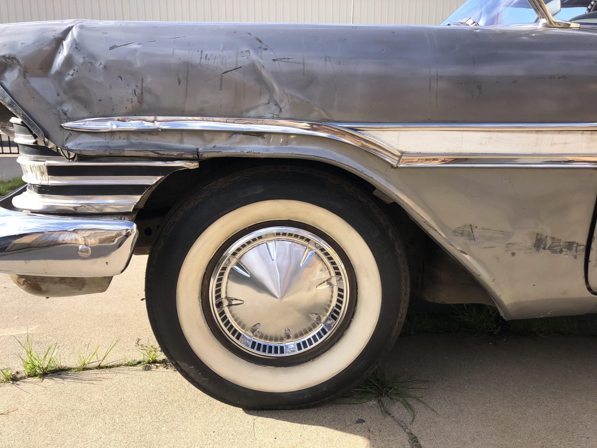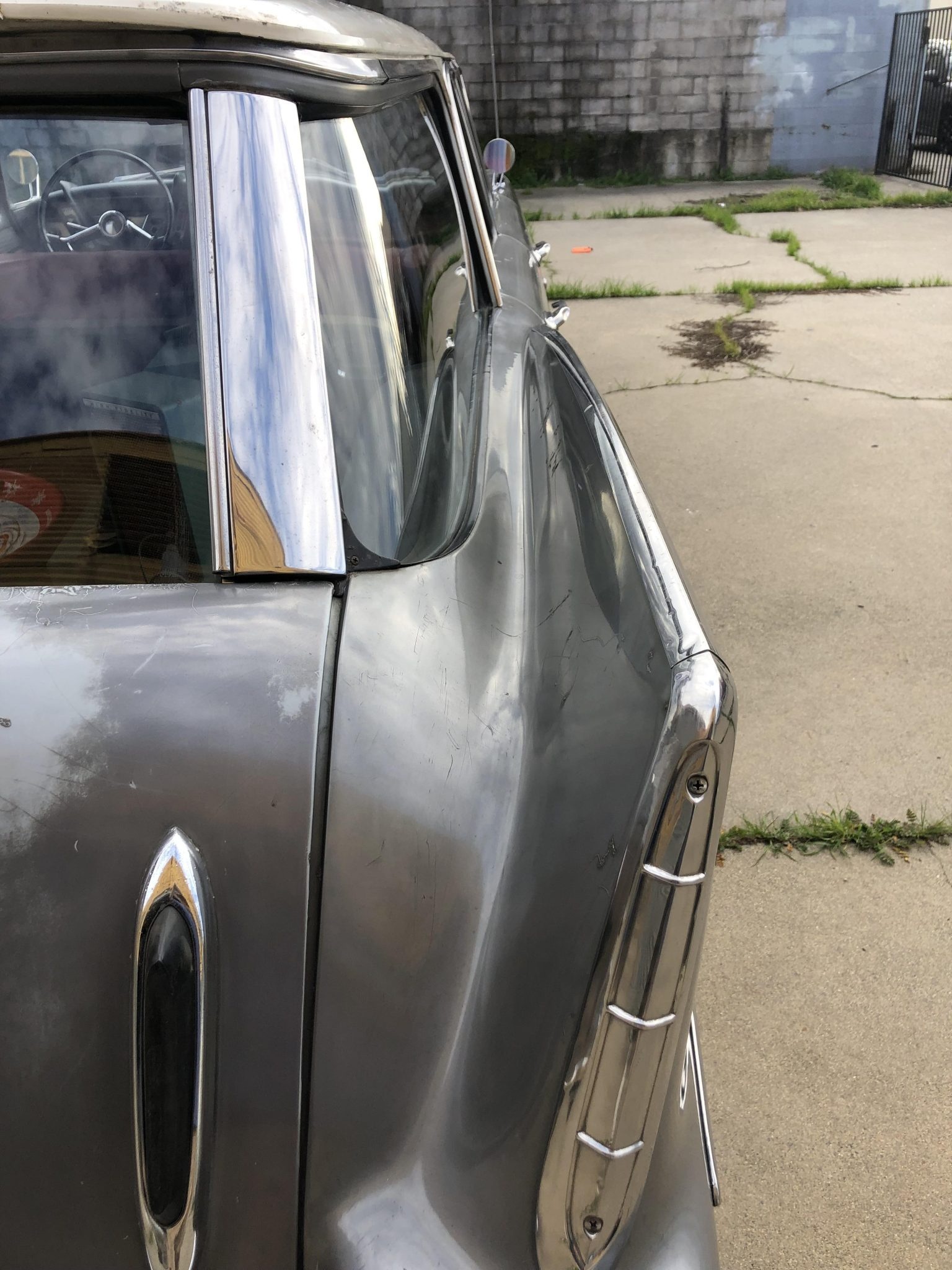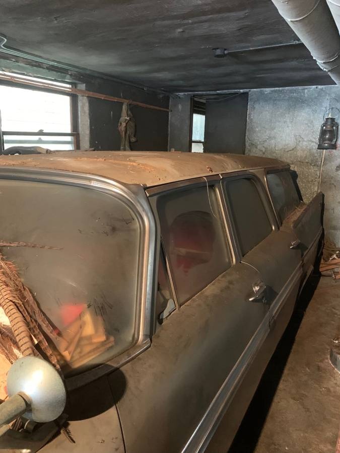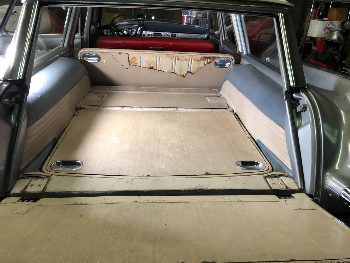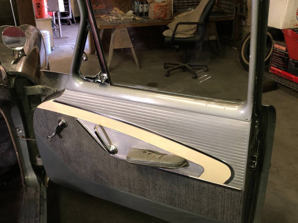The car was originally finished in Silver Gray with an Iceberg White roof and is believed to have been refinished prior to storage. Features include four headlights with eyebrows, chrome bumpers and trim, side spears with patterned aluminum inserts, dual fender-mounted side mirrors, quarter-panel gravel guards, tail fins, and a drop-down tailgate with rubber guards and a hand-cranked window. Both front fenders are dented as are the passenger-side front door, rocker panel, and quarter panel.