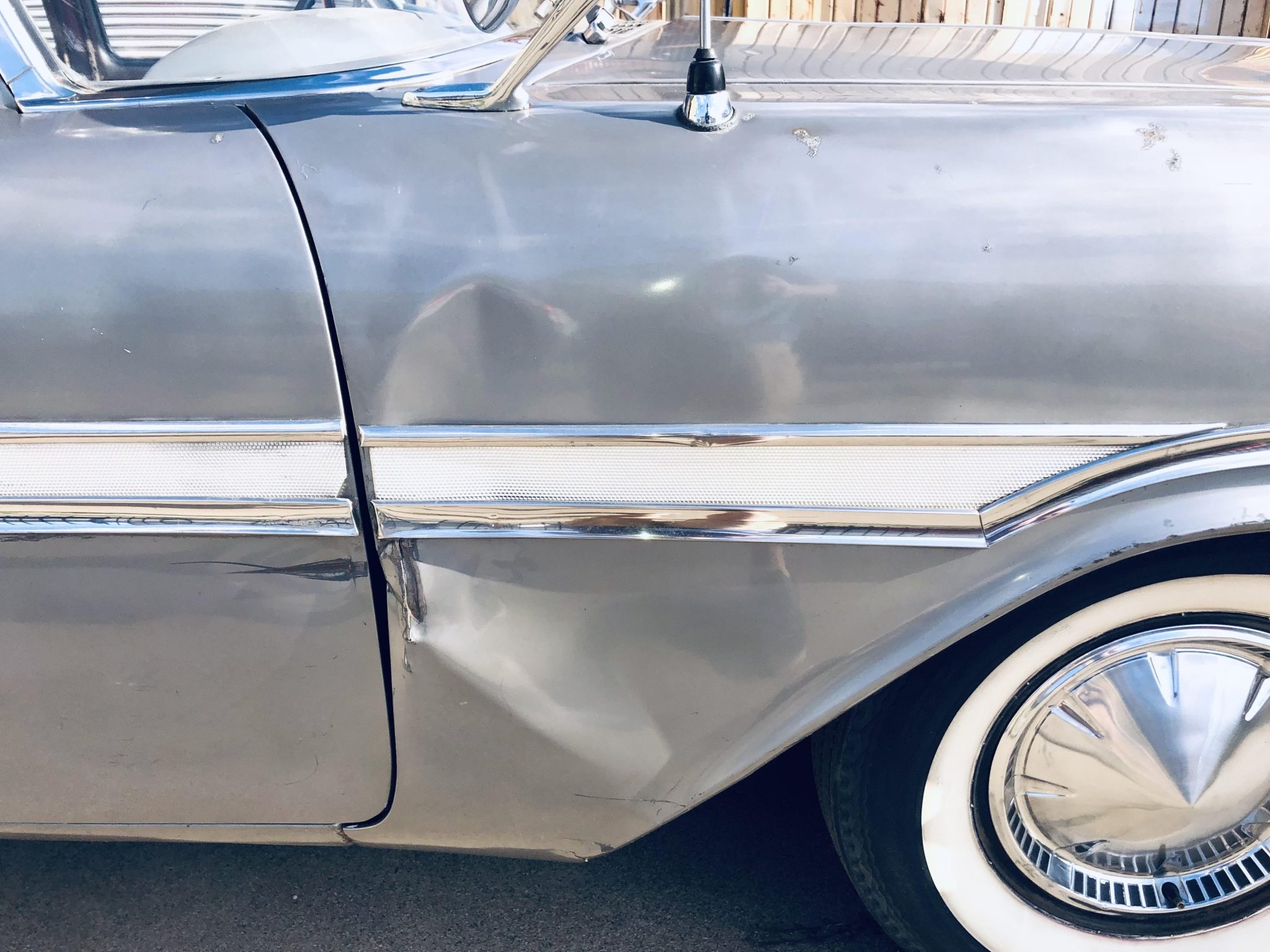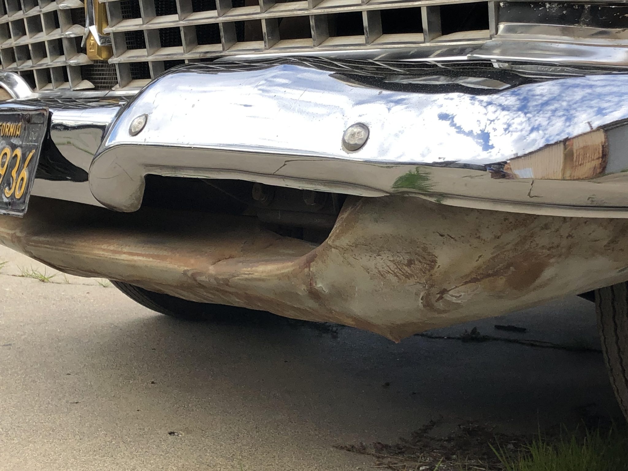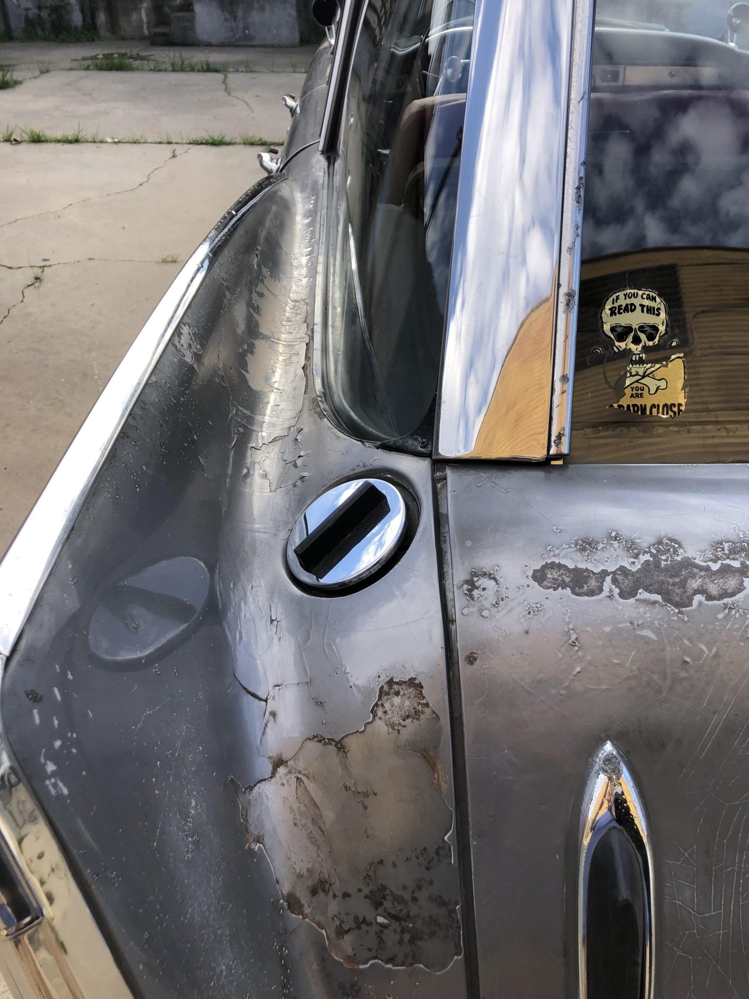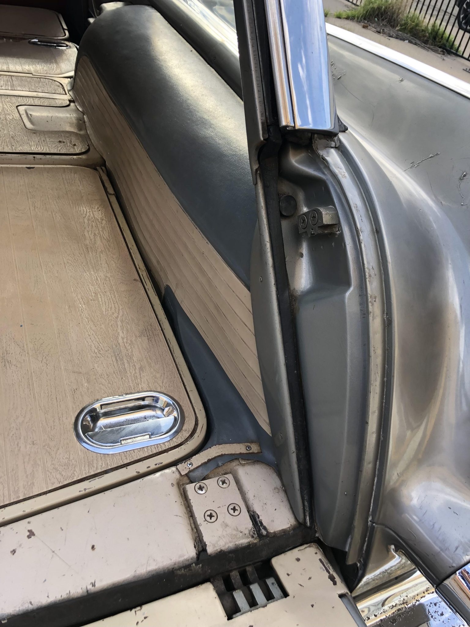 The car was originally finished in Silver Gray with an Iceberg White roof and is believed to have been refinished prior to storage. Features include four headlights with eyebrows, chrome bumpers and trim, side spears with patterned aluminum inserts, dual fender-mounted side mirrors, quarter-panel gravel guards, tail fins, and a drop-down tailgate with rubber guards and a hand-cranked window. Both front fenders are dented as are the passenger-side front door, rocker panel, and quarter panel.