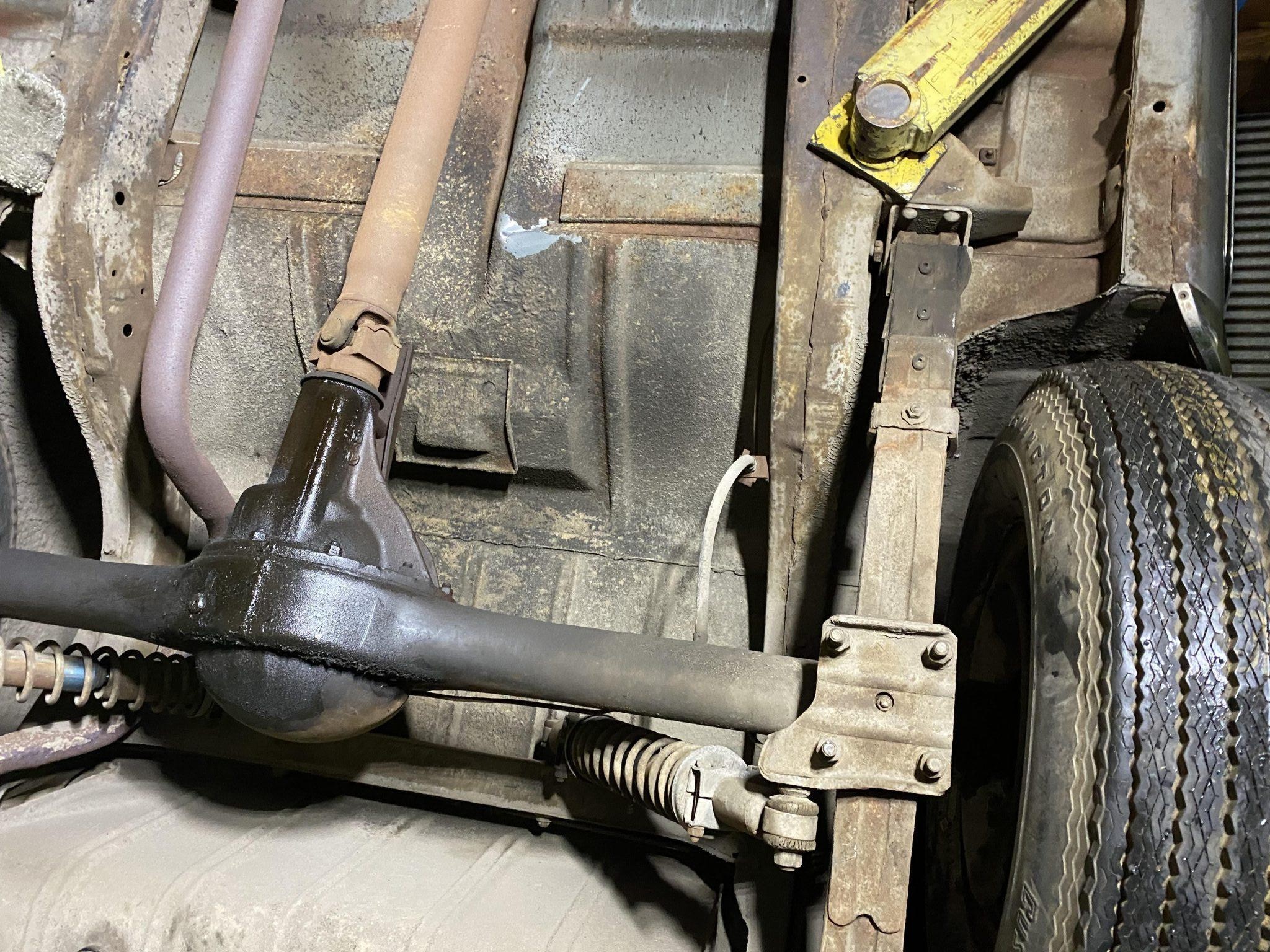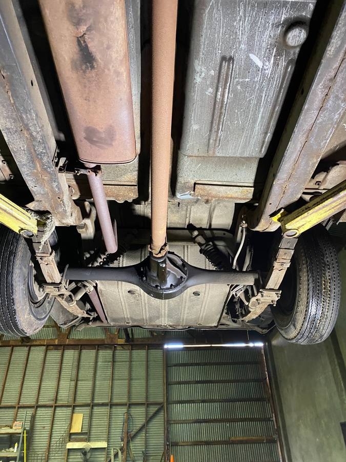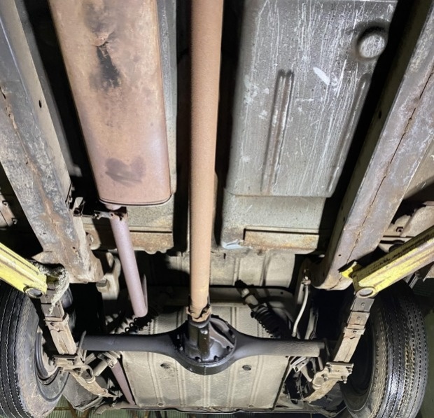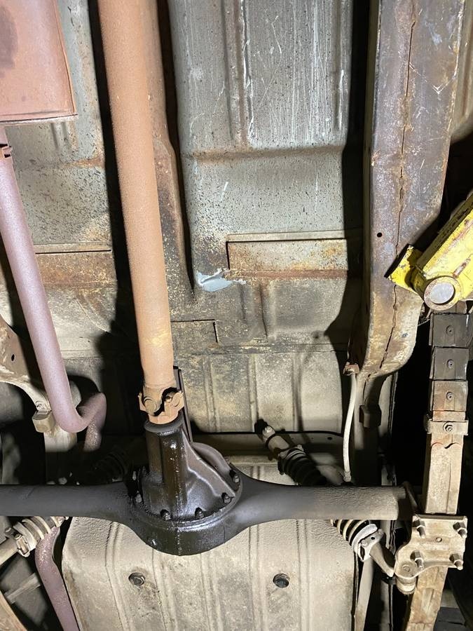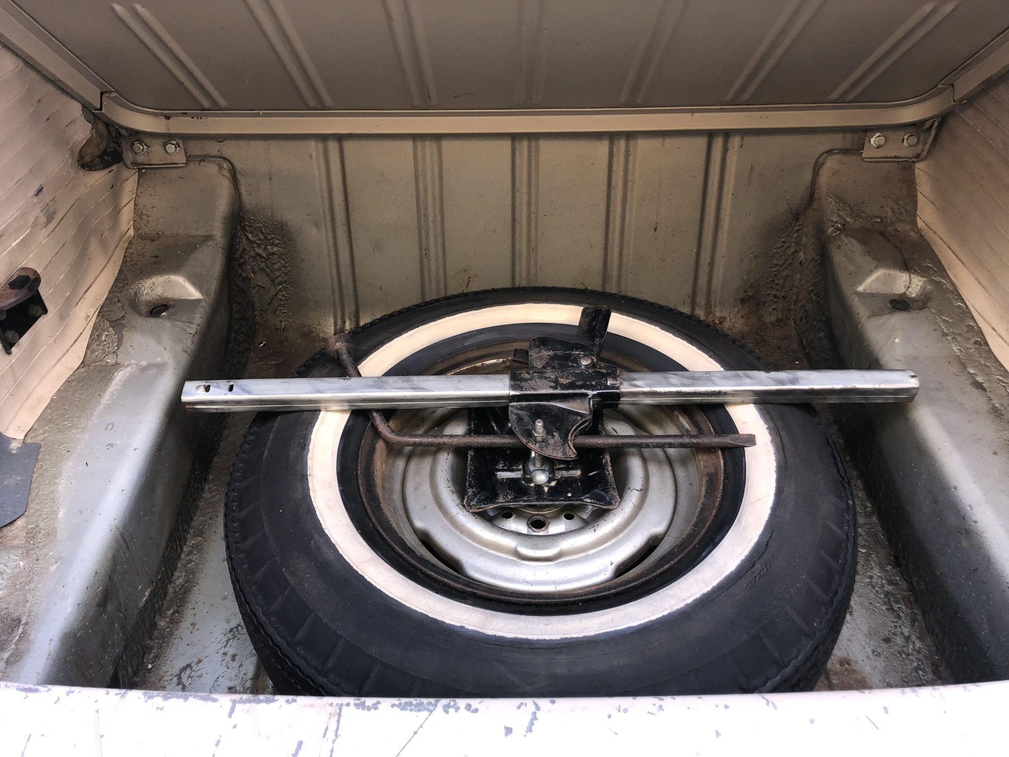 Black 15″ steel wheels with polished covers wear Remington whitewall tires with sidewall cracks, and a spare is stored beneath the cargo deck. The drum brakes are reported to be inoperative.