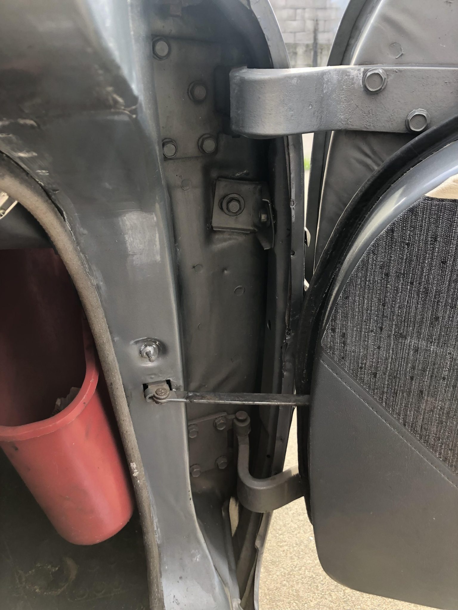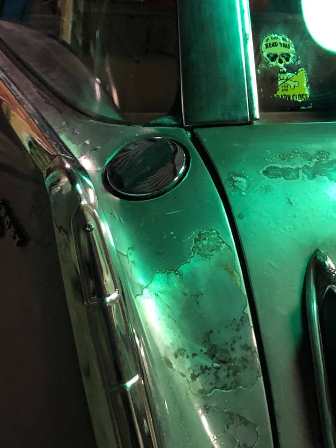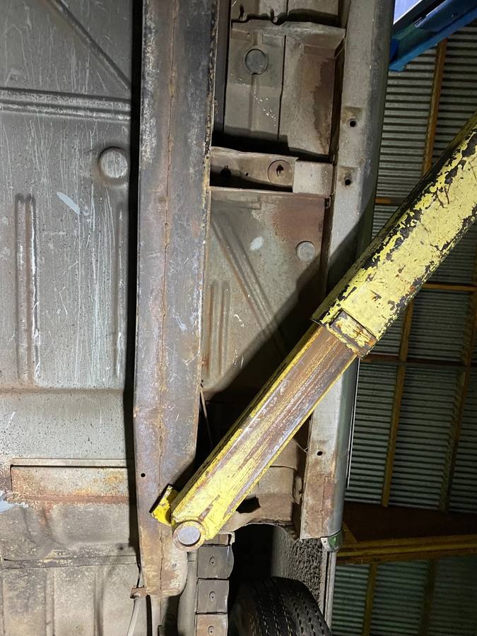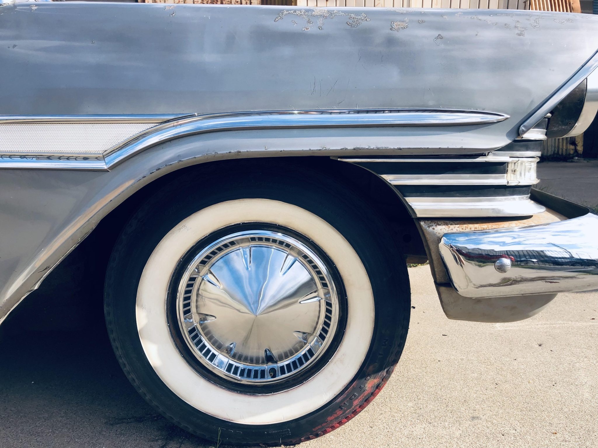 Black 15″ steel wheels with polished covers wear Remington whitewall tires with sidewall cracks, and a spare is stored beneath the cargo deck. The drum brakes are reported to be inoperative.
