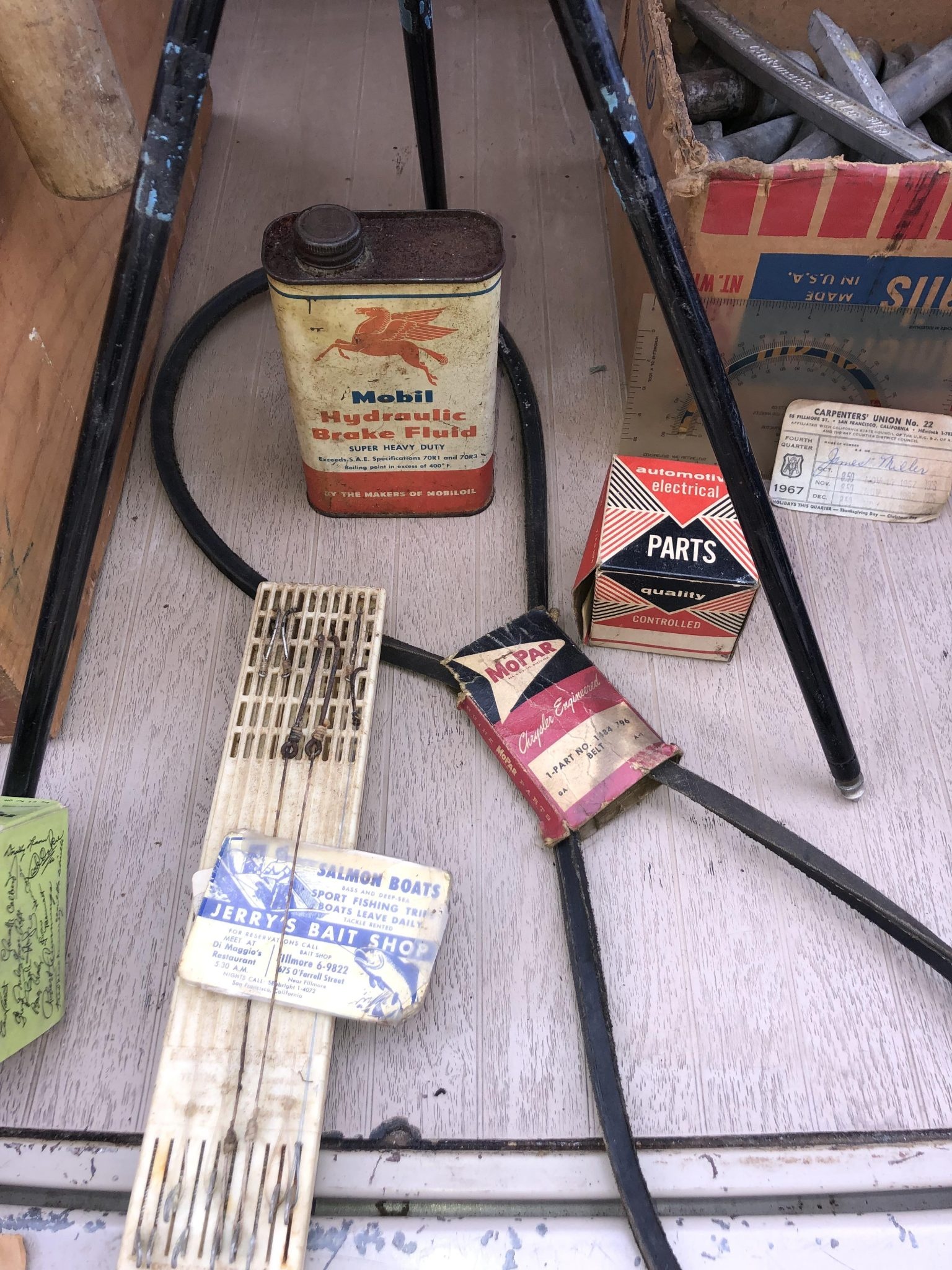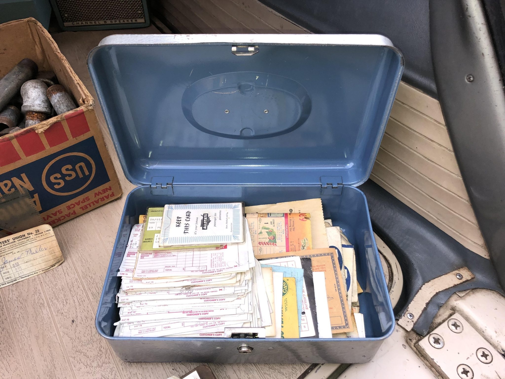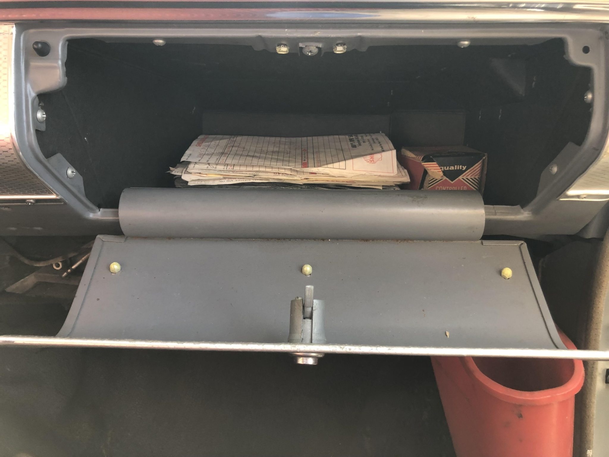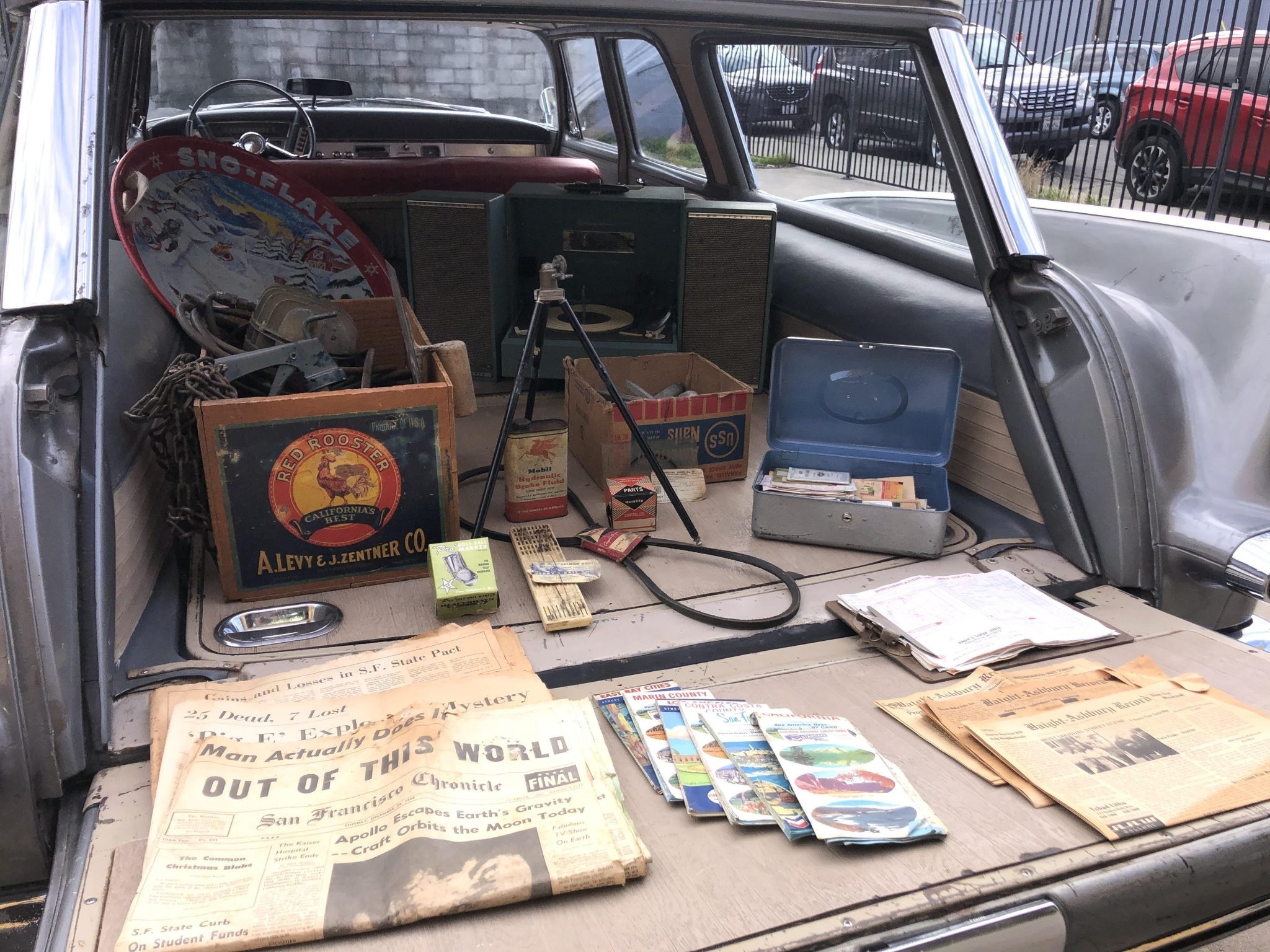 The car’s contents at the time of its recovery from storage accompany the vehicle and include a portable record player, a snow disc sled, assorted automotive and non-automotive parts, service receipts, and a variety of period California publications including newspapers, road maps, and a winter sports guide.