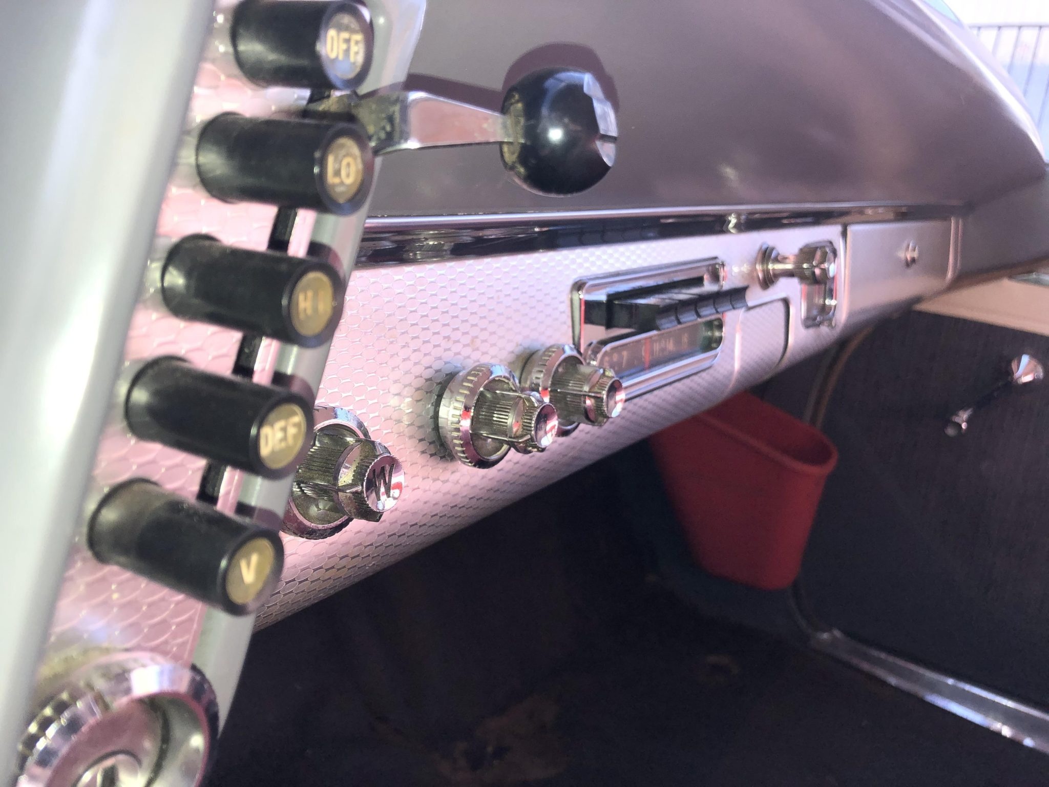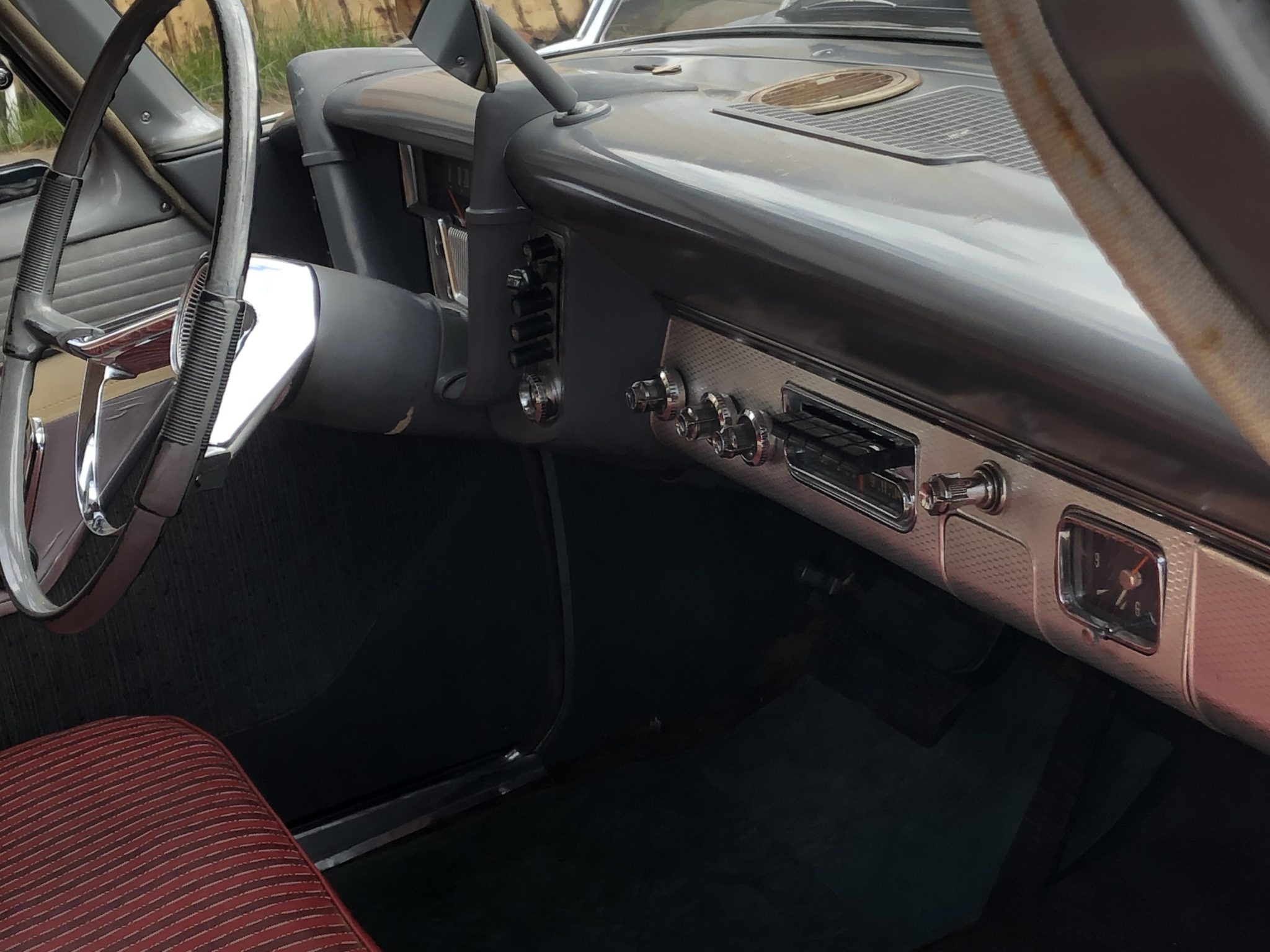 A two-spoke steering wheel with a chrome horn rings fronts a 120-mph horizontal-sweep speedometer and gauges for fuel level and coolant temperature. A row of push-buttons to the left of the instruments provide gear selection for the automatic transmission and those to the right control ventilation and heat. The five-digit odometer shows 65k miles. The seller reports that there is no key.