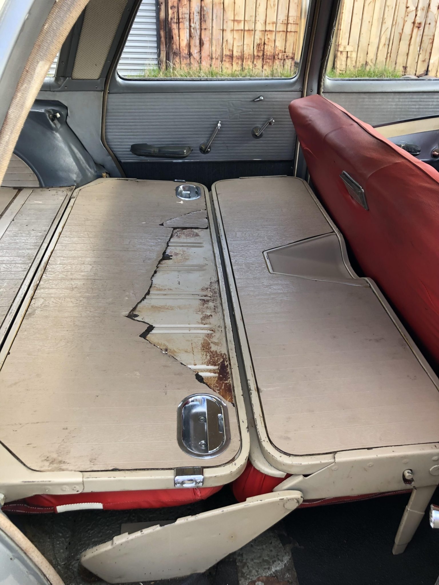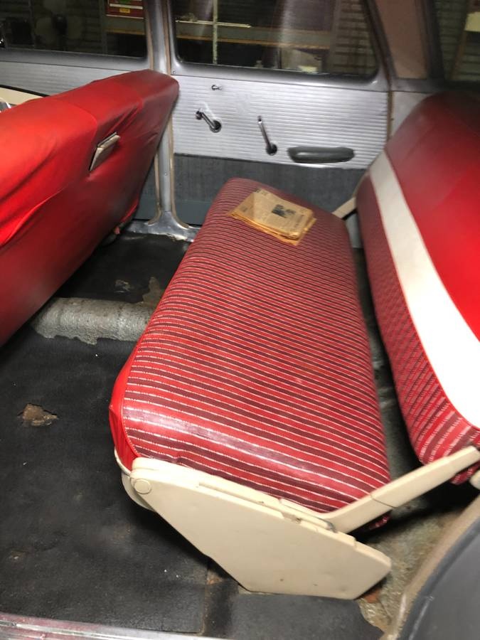 The cabin features front and rear bench seats upholstered in red vinyl with cream stripes as well as gray door panels with cream stripes, and a body-colored steel dash with patterned aluminum inserts. Amenities include a push-button AM radio and a clock. The rear seat folds flat to elongate the cargo area.