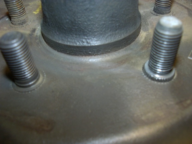 Here’s where the fun begins. You now need to press in new studs. The stock lug bolts on these old Mopars are 1/2-20 UNF thread with a 0.622" knurl. The knurl is the ridged part of the stud that fits into the hub. In order to have a good tight press fit you need to make sure whatever stud you use has a knurl size of at least 0.622", but it can’t be too large either. If it’s too large, it will be difficult to press in and you stand a chance of damaging the hub. NAPA has studs that have a 0.623" knurl (part number BK 641-1128) and these work very well. Below is a picture of the hubs with these non-swedged studs installed.