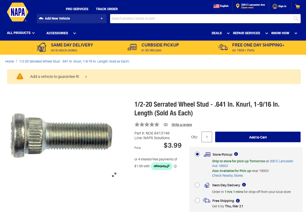 Here’s where the fun begins. You now need to press in new studs. The stock lug bolts on these old Mopars are 1/2-20 UNF thread with a 0.622" knurl. The knurl is the ridged part of the stud that fits into the hub. In order to have a good tight press fit you need to make sure whatever stud you use has a knurl size of at least 0.622", but it can’t be too large either. If it’s too large, it will be difficult to press in and you stand a chance of damaging the hub. NAPA has studs that have a 0.623" knurl (part number BK 641-1128) and these work very well.