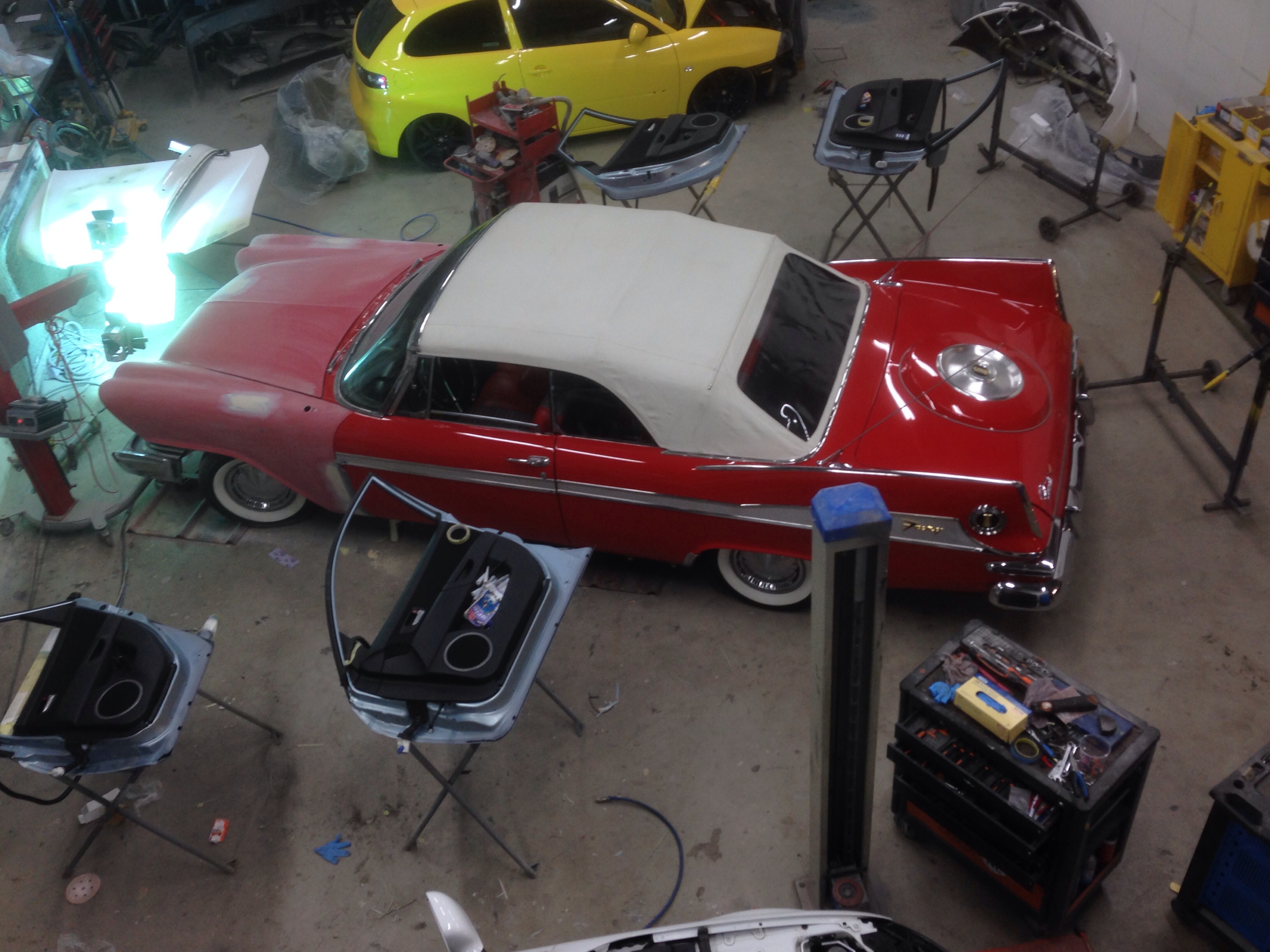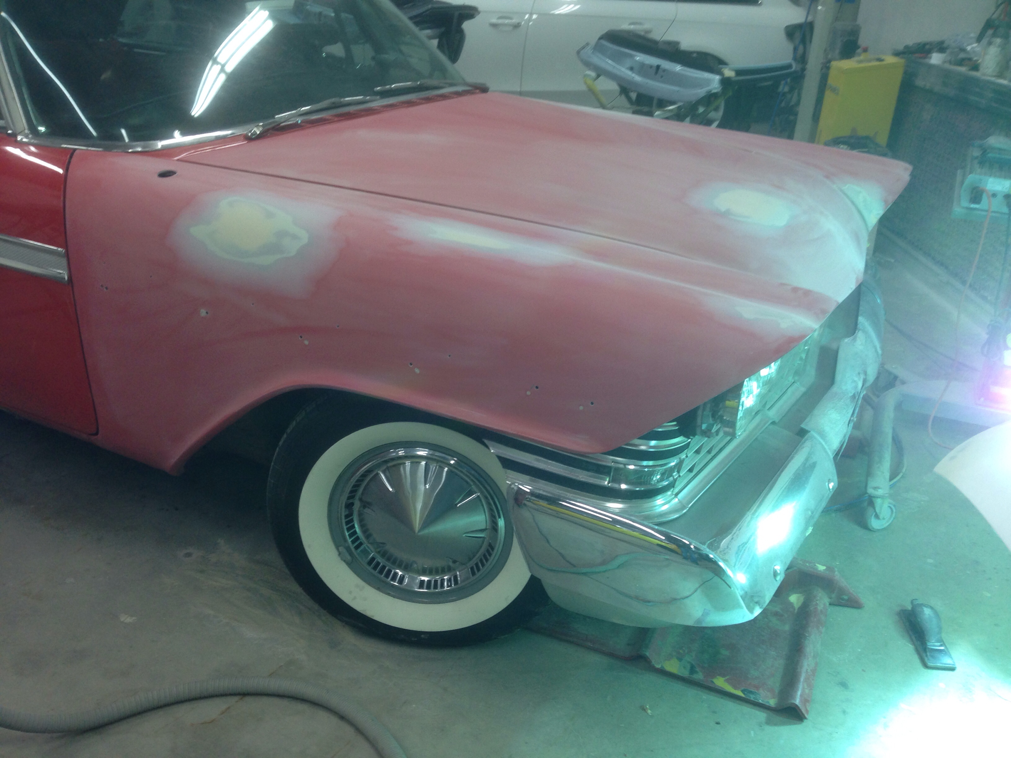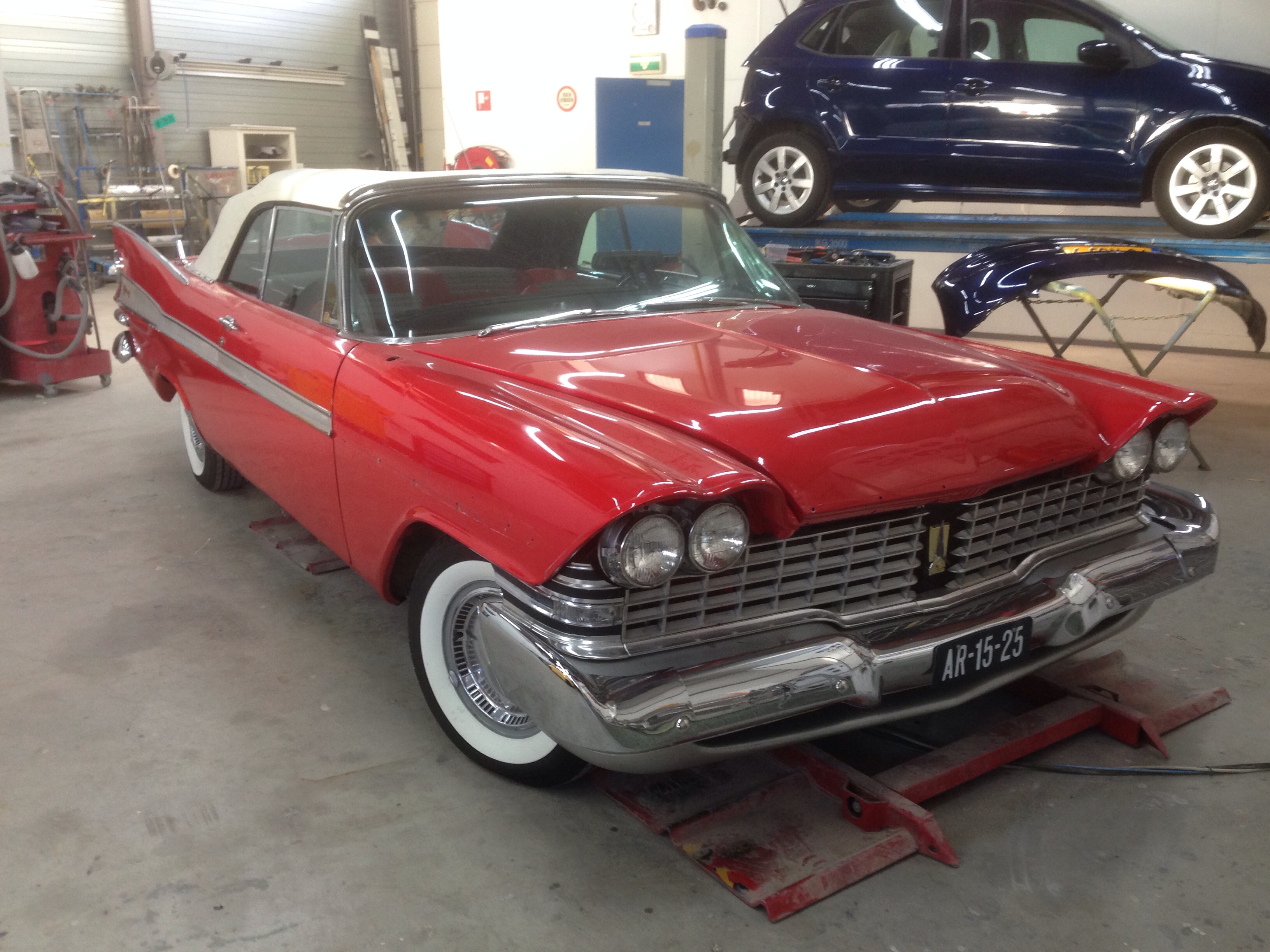 There were a few dents and scratches and 2 small rust spots. After I fell over a ladder last week that landed on the right front fender it was time to have the front repainted. An appointment was made and I drove the car to the painter this morning. It should be ready tomorrow!