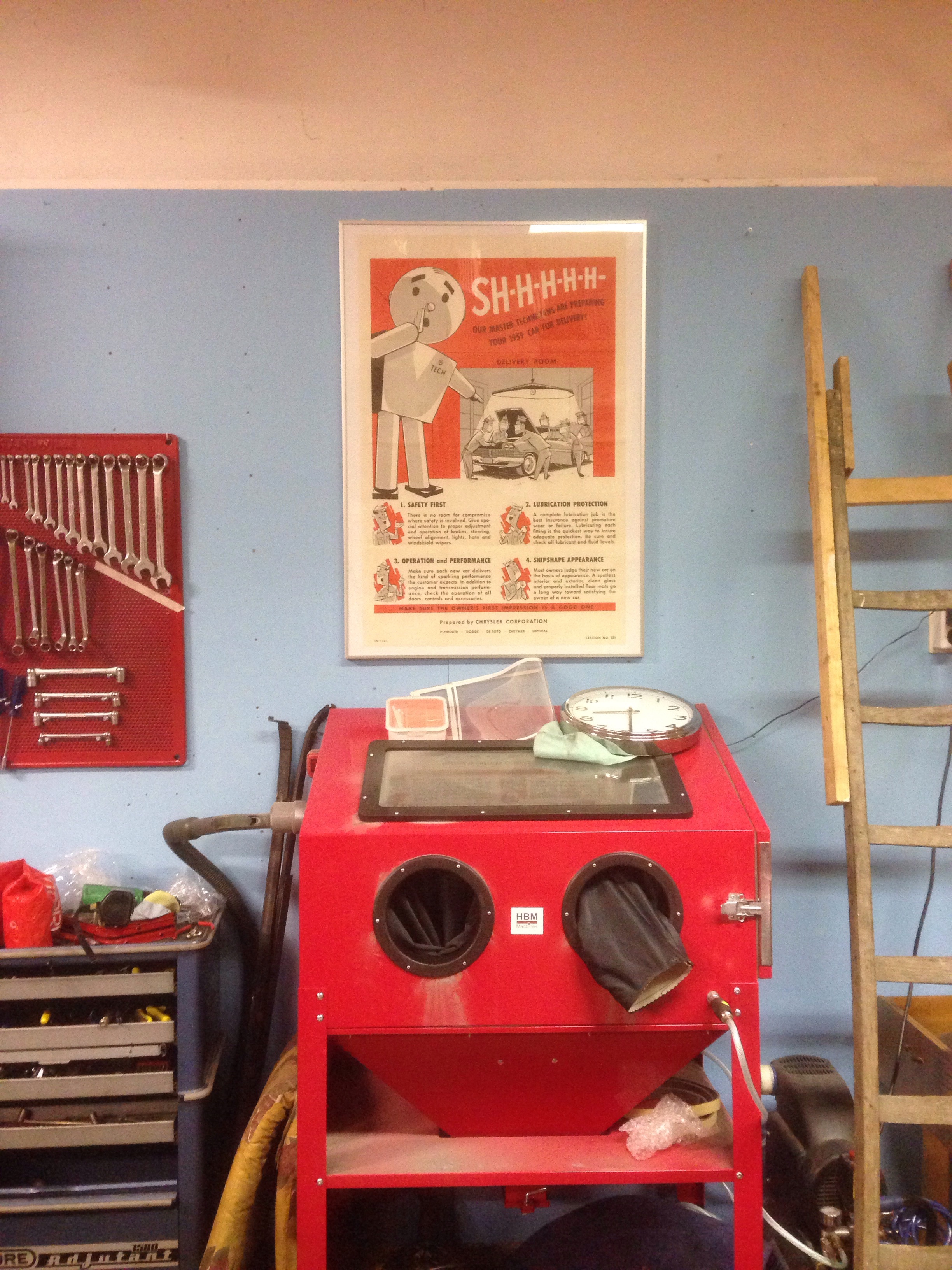 I also bought a sand blasting cabinet. We had a lot of advertisments that we put on the wall