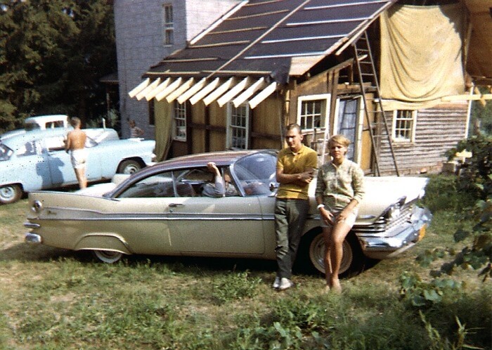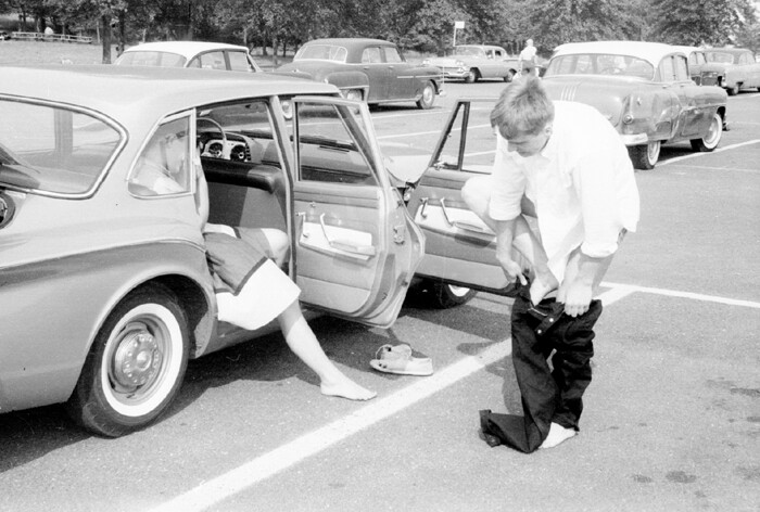 Nice Valiant. A friend had a 1960 Valiant which I thought had a unbelievably compliant ride. The two photos show us going to Jones Beach on Long Island and getting dressed in the parking lot for the trip home.