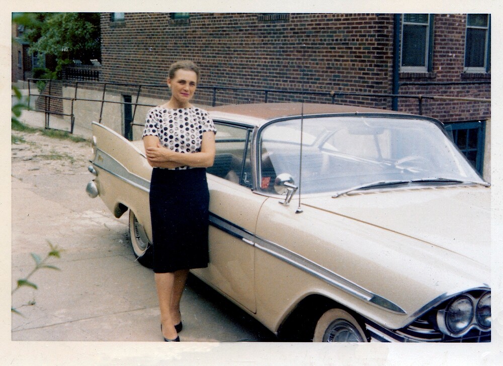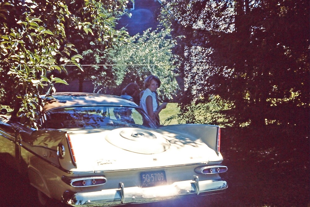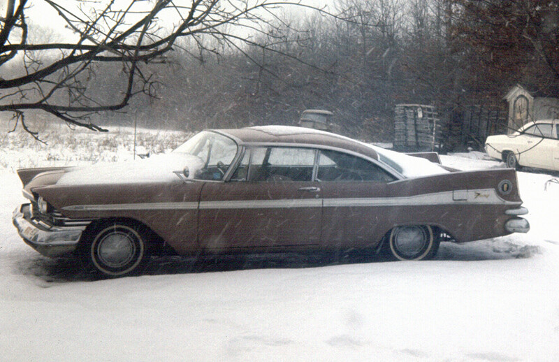 My Sport Fury was only 5 months old when I turned into a telephone pole, putting a vertical dent, on the driver’s side, from belt line to rocker. That dent stayed until 1965 when I had some bodywork done and the car repainted copper to match the roof’s original color. In the photo, taken 1961, you can make out the dent right behind the driver door. Also visible are the fender skirts and red reflective tape fitted to the rear of the fins. Another fabrication I did was to replace the parking light sockets with twin contact brake light sockets. Now both red lights on each side would signal my turns.