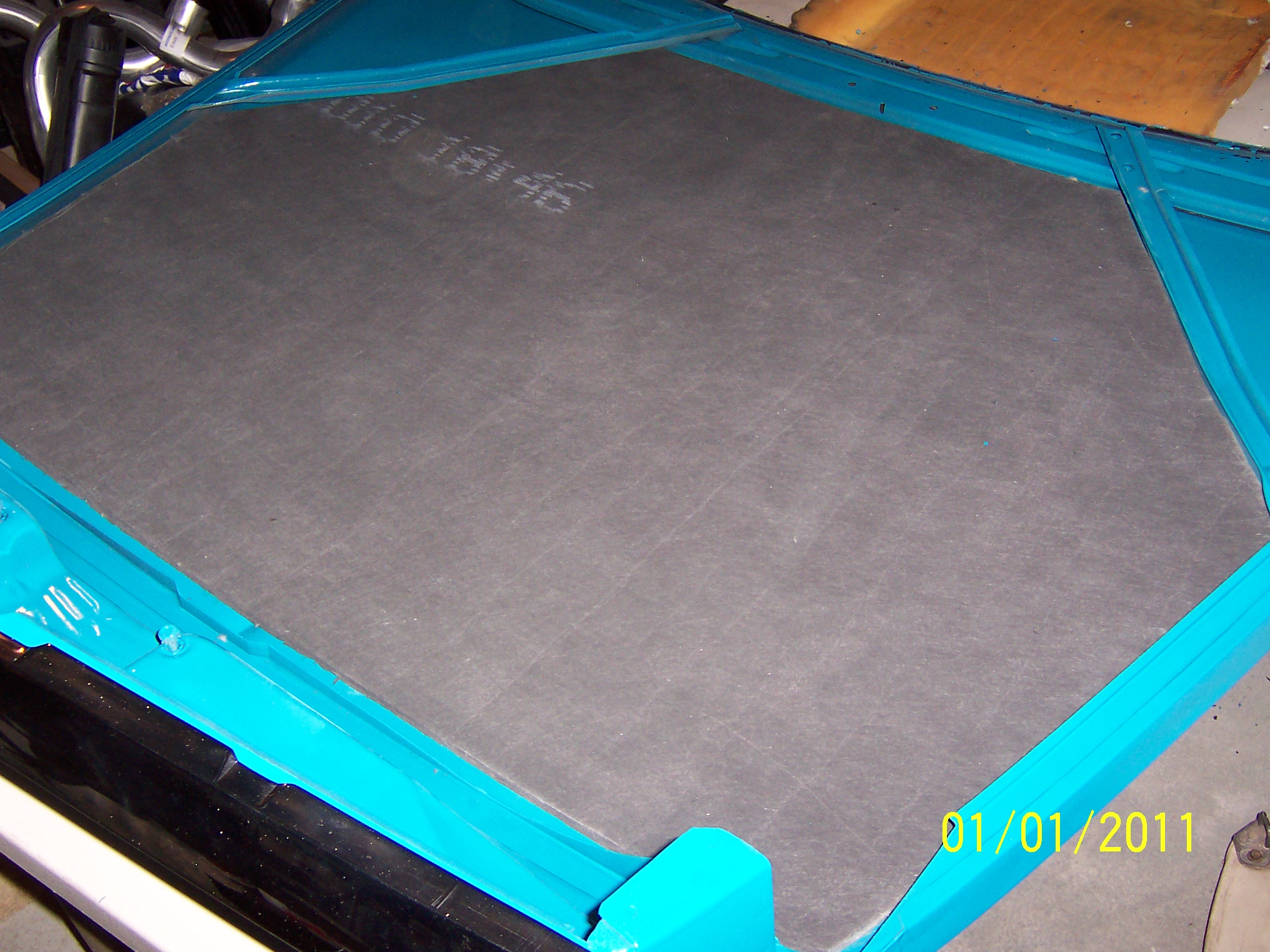 Since I have both fenders and the hood in the basement waiting for final installation. I have place the hood upside down on a cardboard table (actually a plasic one) so I won’t have to fight gravity on a hood that is installed on its hinges. I have the outline of the perimeter of the old pad residue I could not get off. So location of the pad will be a snap.