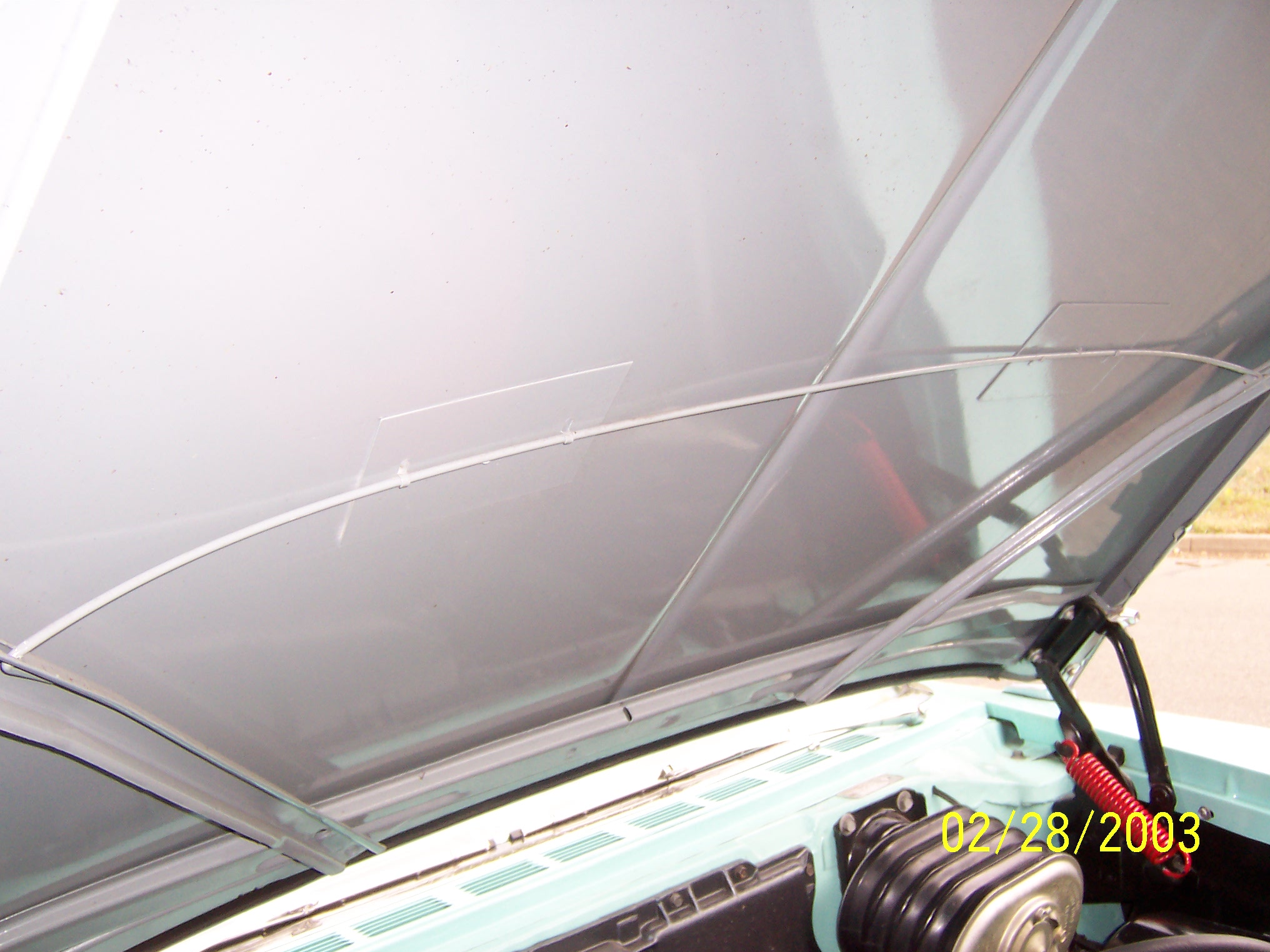 I did take a couple pictures of me gluing but really nothing informative about them. I have the type of hood that does not have the underneath support structure of the long transverse spring rods attached to welded pads. Don’t know if people are aware of the two styles that were made on our 59 Hoods. The the two hoods style are the same except for this “anti-oil canning” support to the underside on one of the types. Don’t know which one came first or if they were made in two different stamping plants at the same time or a production change took place in the model year to add or delete them (cost savings). Even my father who was a Chrysler Stamping Engineer back in 59 could not recall this change or reason for it.