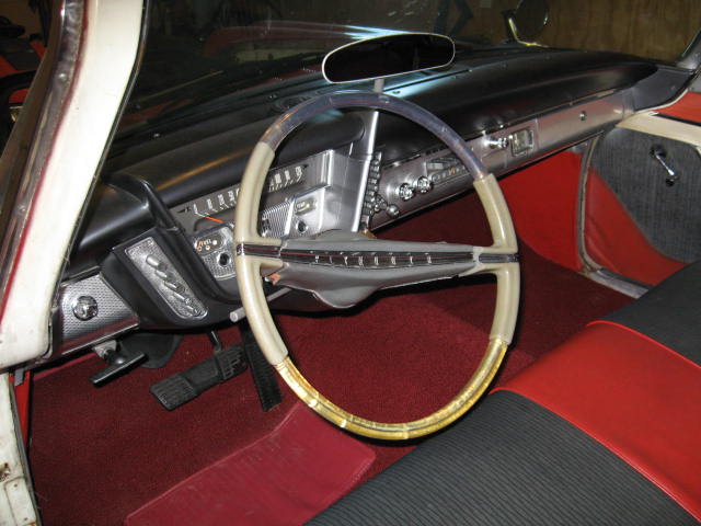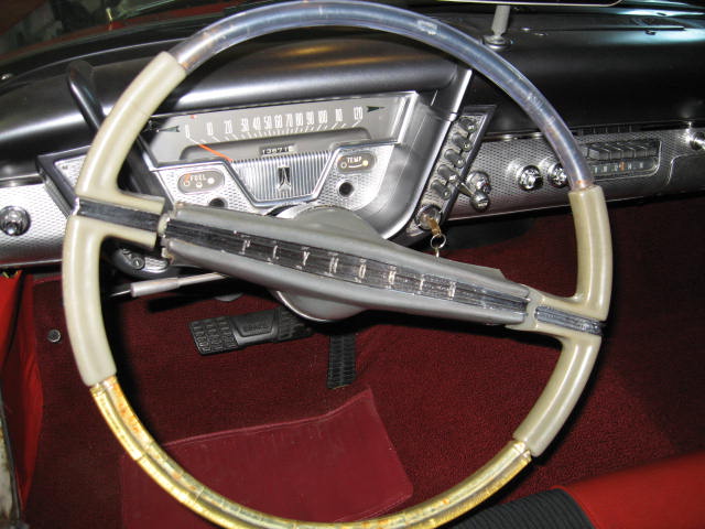 What you have is a wheel that is found on a Sport Fury and somebody cut off or broke the horn ring.I do not know if that wheel was changed or it was offered on your model.
